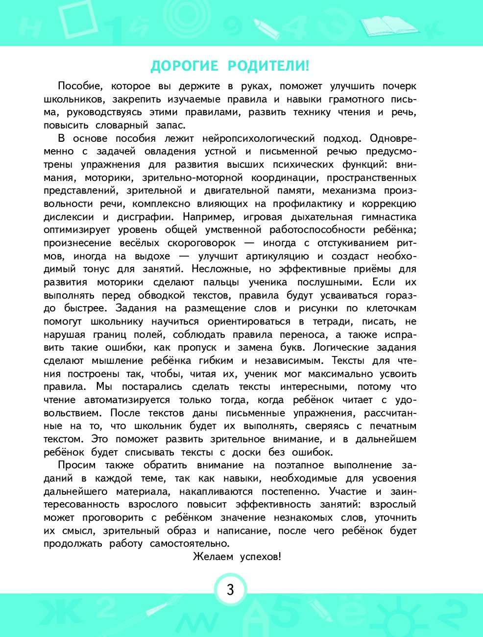 В основе пособия лежит нейропсихологический подход, т. е. одновременно с задачей овладеть письмом и грамотностью в нём предусмотрены упражнения для развития внимания, пространственного представления, межполушарных взаимодействий, зрительно-моторной координации, объёма зрительной и двигательной памяти, механизма произвольности речи.