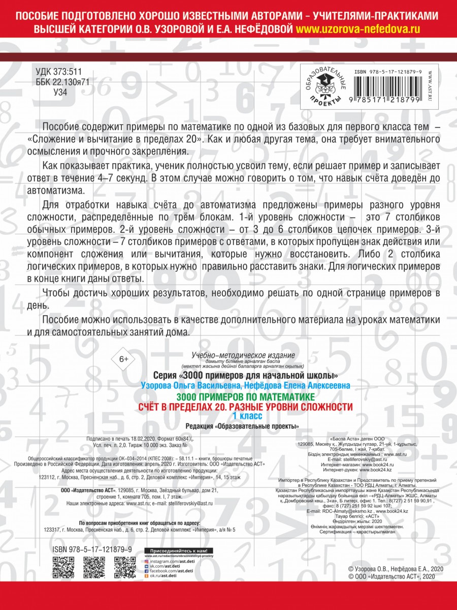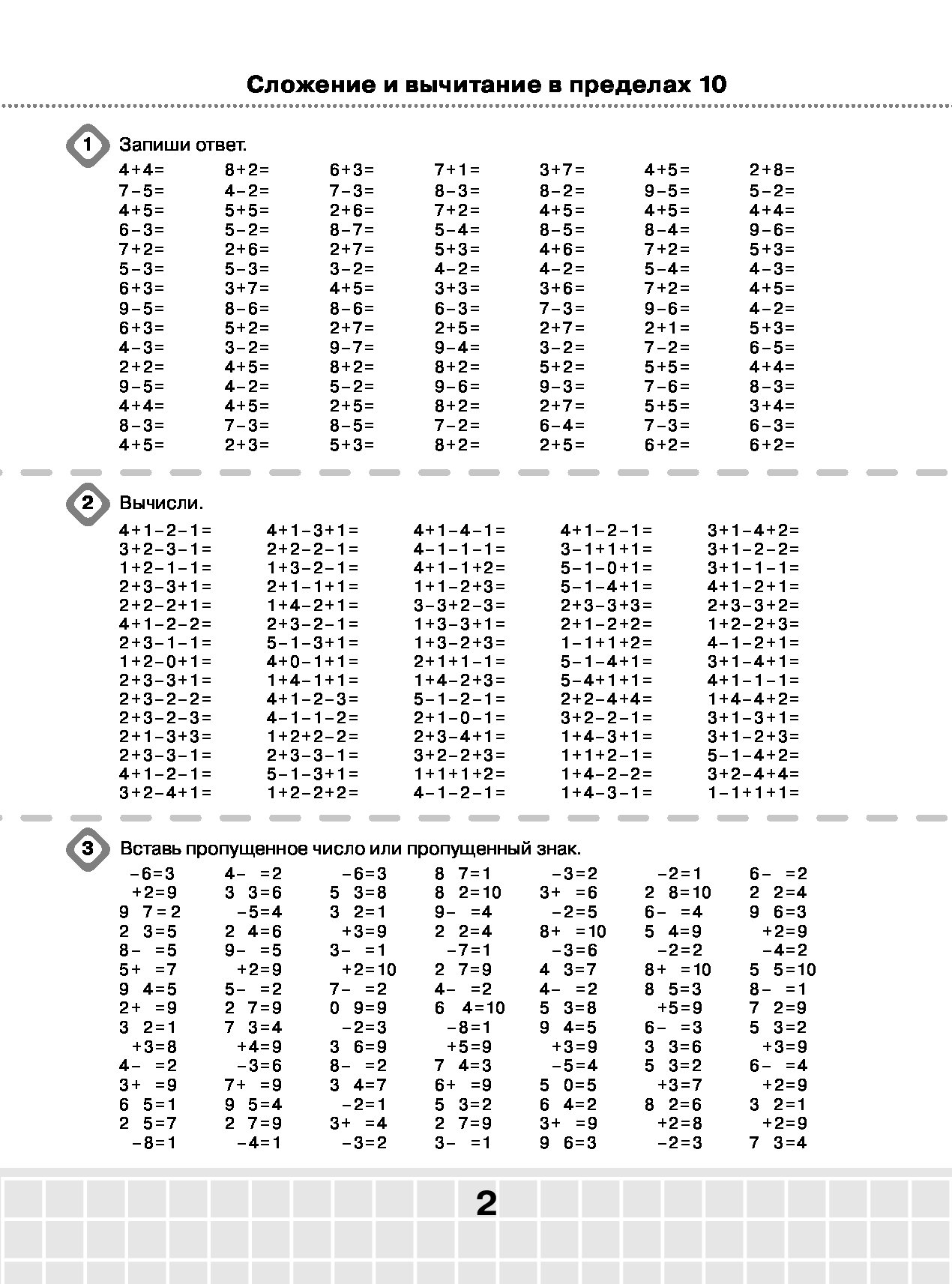 Для отработки навыка счёта до автоматизма предложены примеры разного уровня сложности, распределенные по трём блокам. 1-й уровень сложности – это 7 столбиков обычных примеров. 2-й уровень сложности – от 3 до 6 столбиков цепочек примеров. 3-й уровень сложности – 7 столбиков примеров с ответами, в которых пропущен знак действия или компонент сложения или вычитания, которые нужно восстановить. Либо 2 столбика логических примеров, в которых нужно правильно расставить знаки. Для логических примеров в конце книги даны ответы.