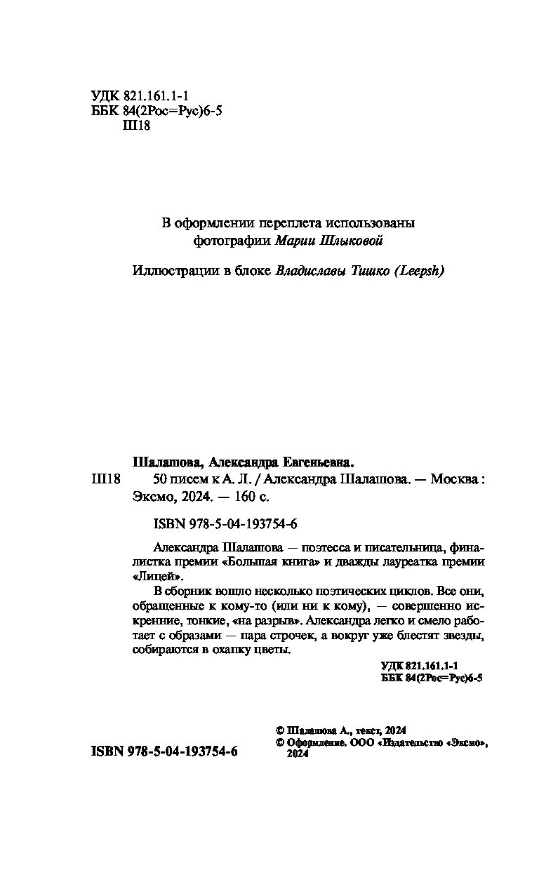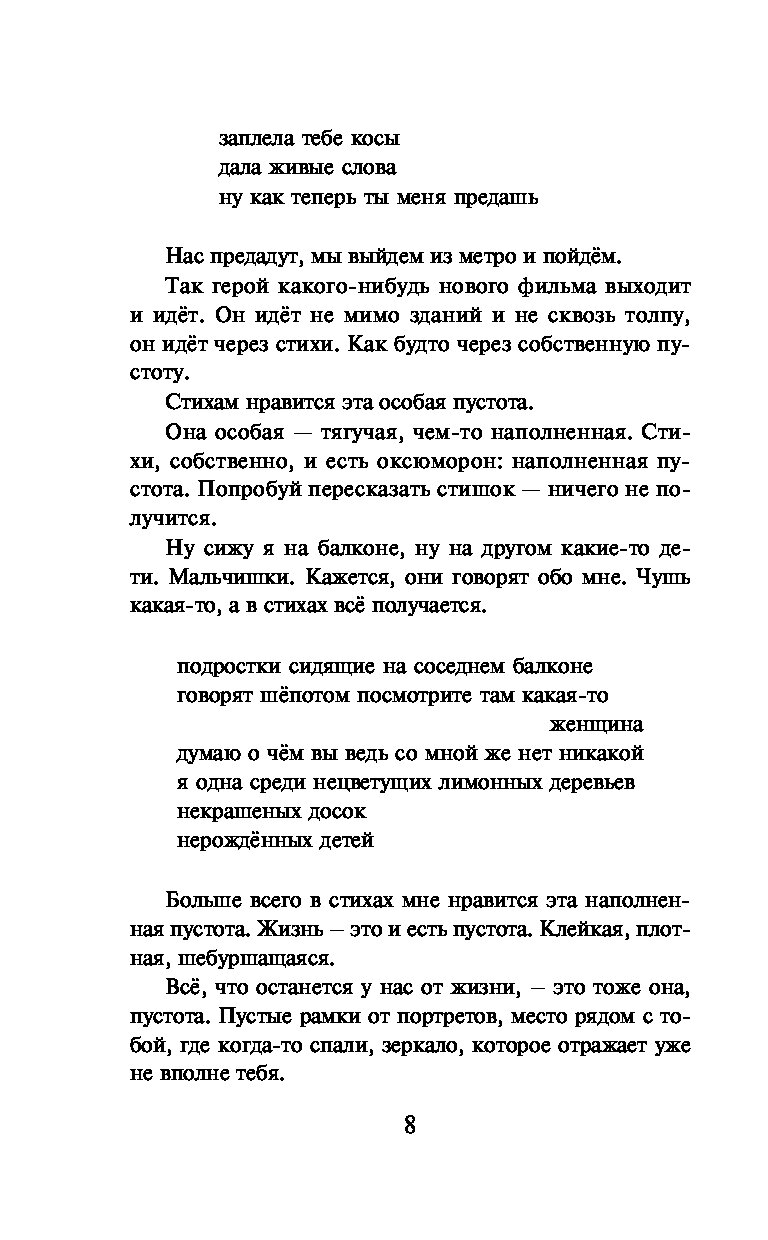 В сборник вошло несколько поэтических циклов. Все они, обращенные к кому-то (или ни к кому), — совершенно искренние, тонкие, «на разрыв». Александра легко и смело работает с образами — пара строчек, а вокруг уже блестят звезды, собираются в охапку цветы.