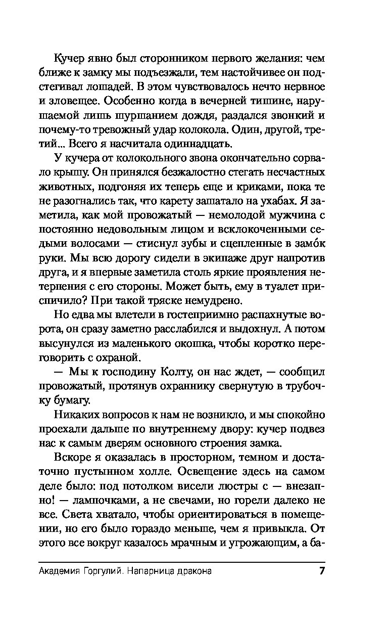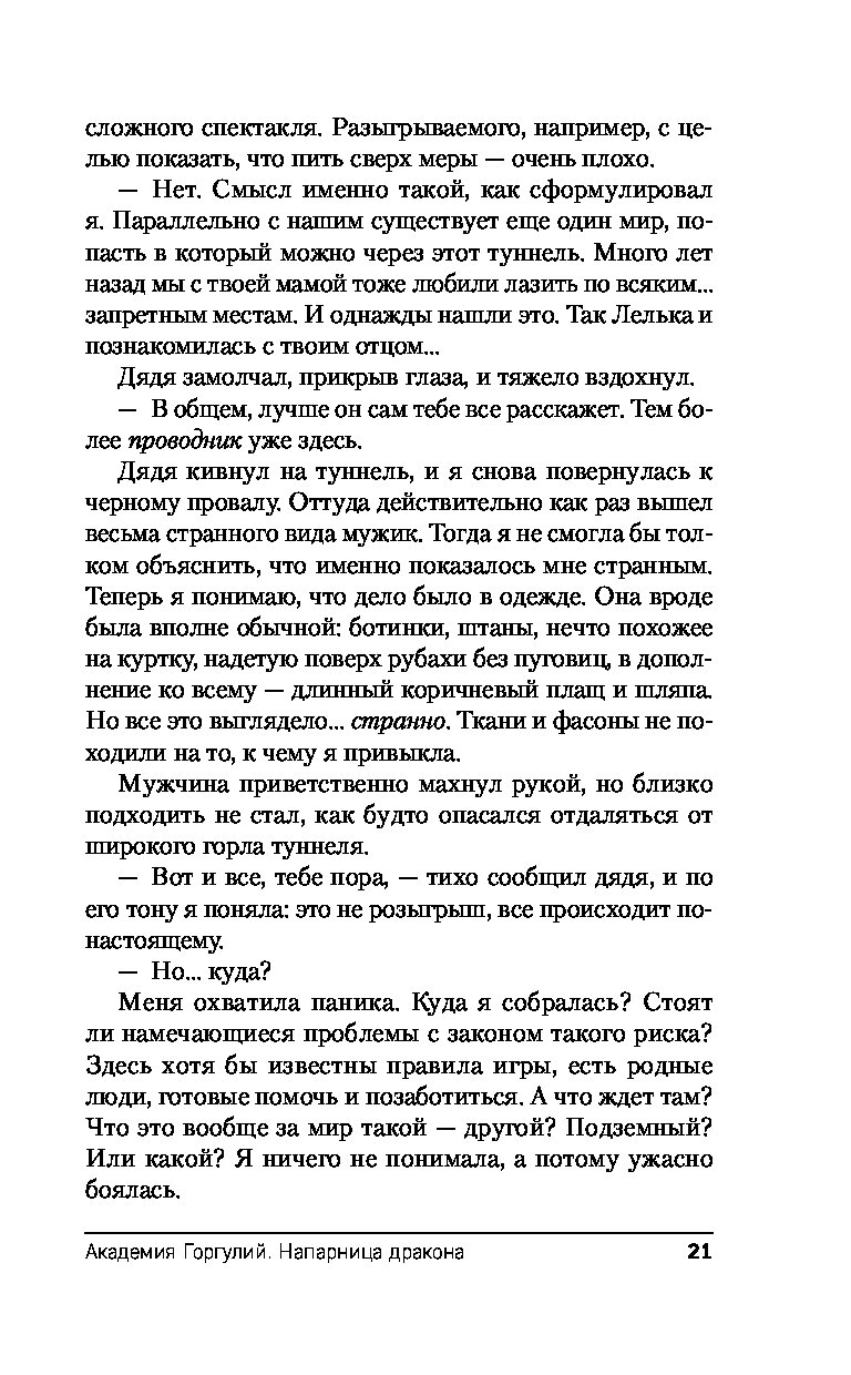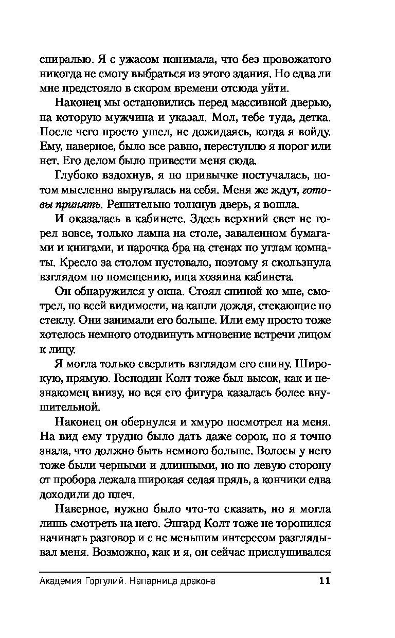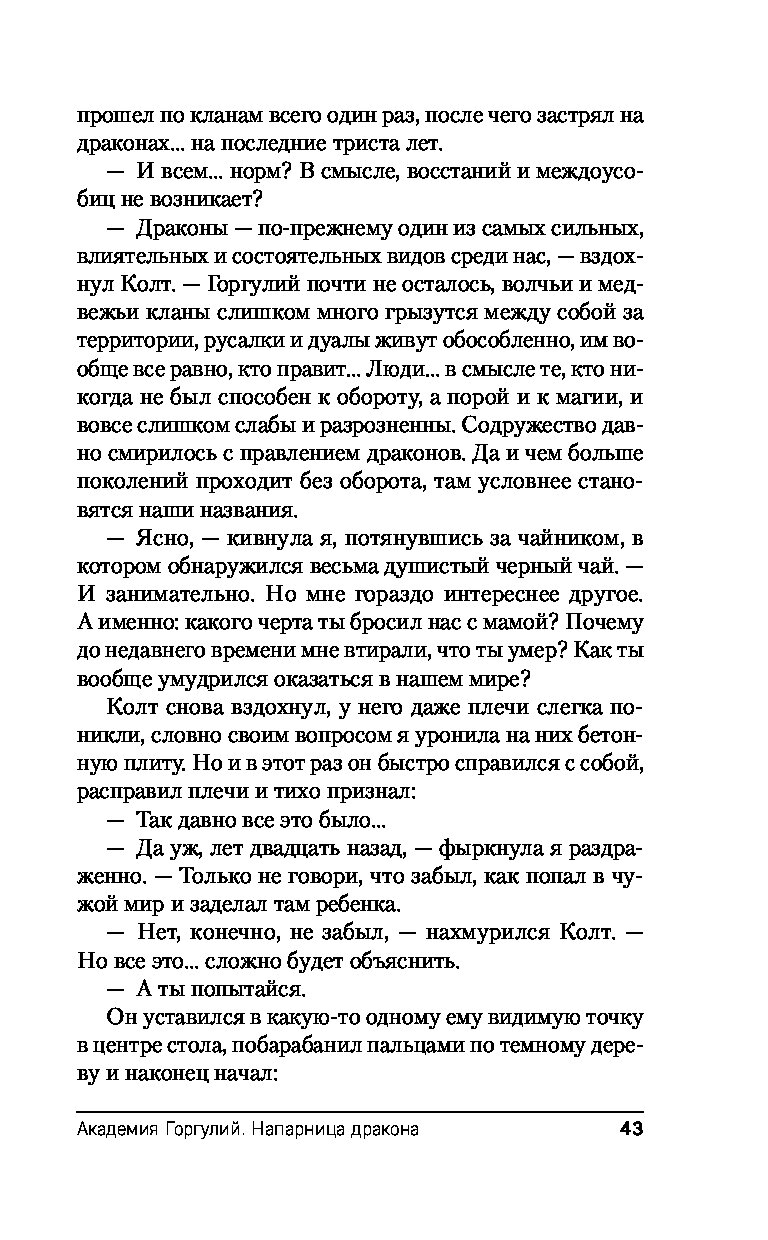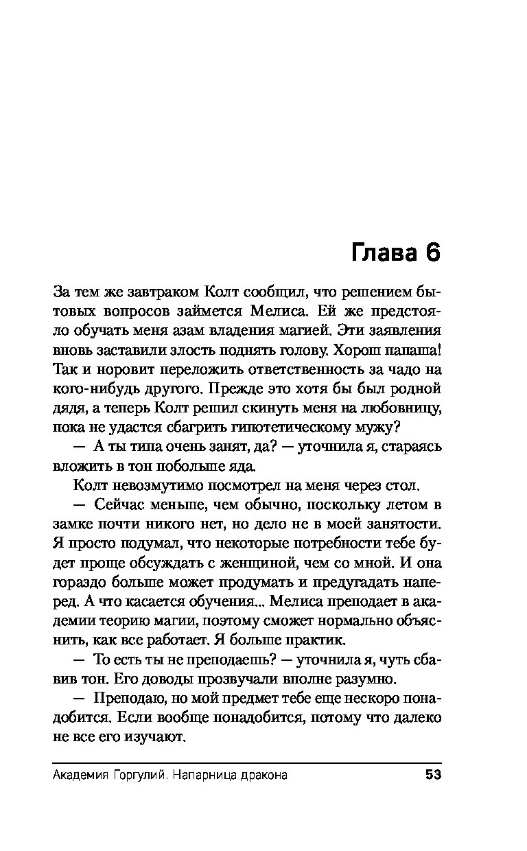 «Академия Горгулий. Напарница дракона» — это увлекательный и динамичный роман, в котором героиня из привычной нам реальности попадает в другой мир, в котором существует магия. Ей предстоит разобраться с собственными чувствами, попытаться наладить отношения с отцом и не влюбиться в красивого преподавателя, ведь он явно хранит какую-то опасную тайну.