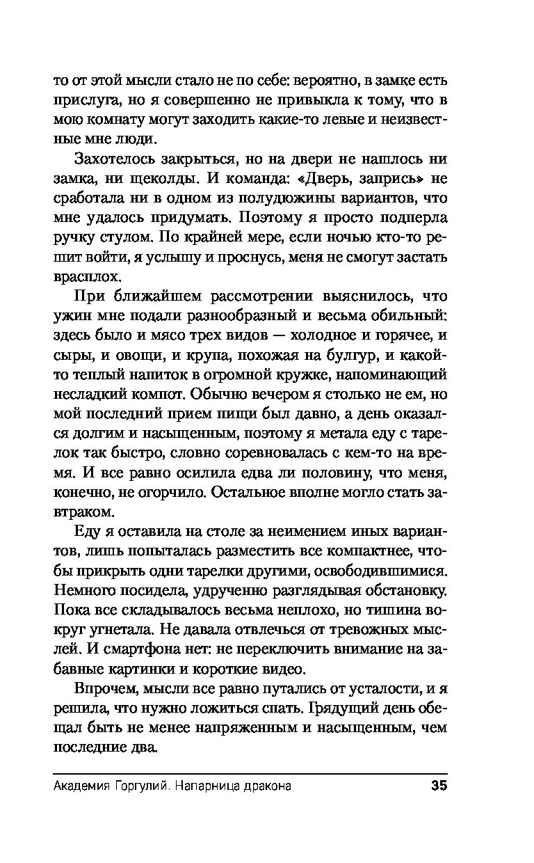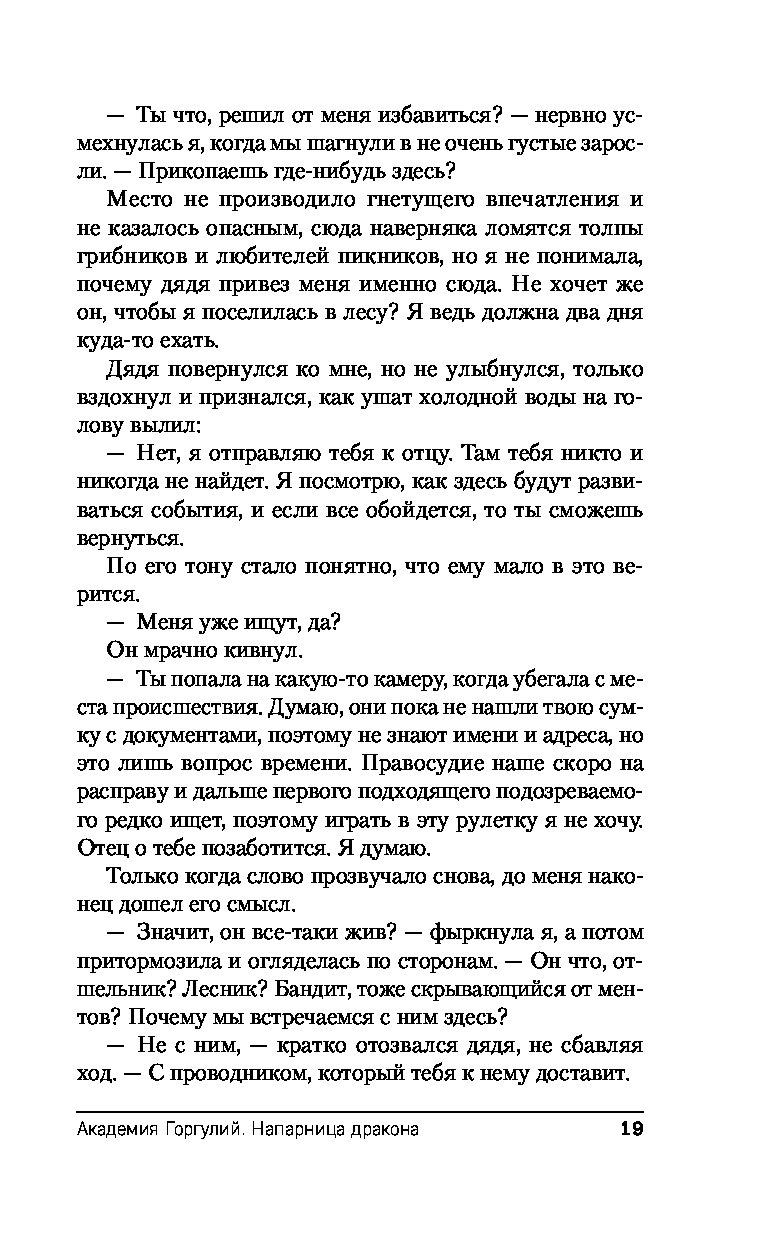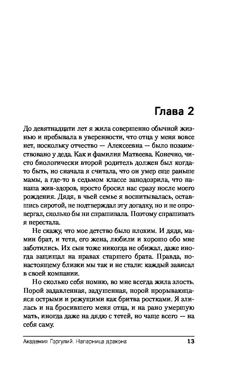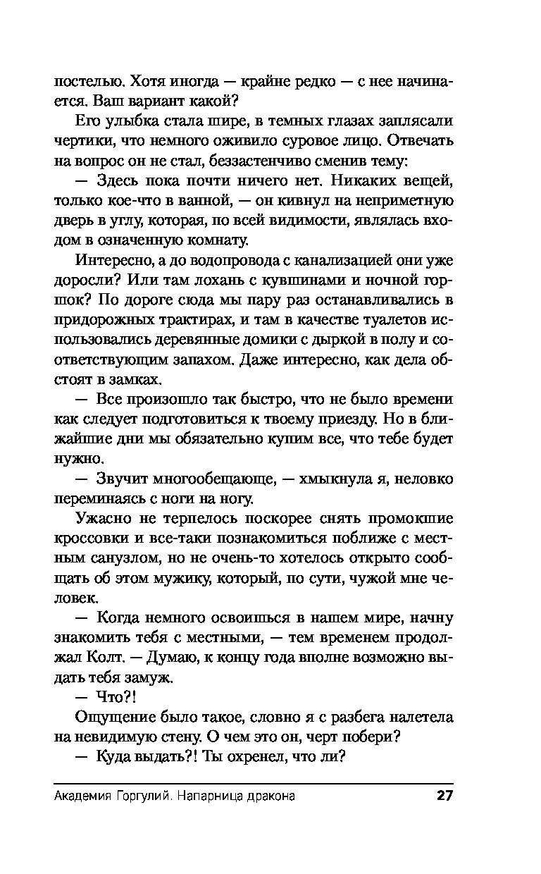 «Академия Горгулий. Напарница дракона» — это увлекательный и динамичный роман, в котором героиня из привычной нам реальности попадает в другой мир, в котором существует магия. Ей предстоит разобраться с собственными чувствами, попытаться наладить отношения с отцом и не влюбиться в красивого преподавателя, ведь он явно хранит какую-то опасную тайну.