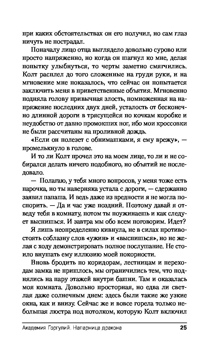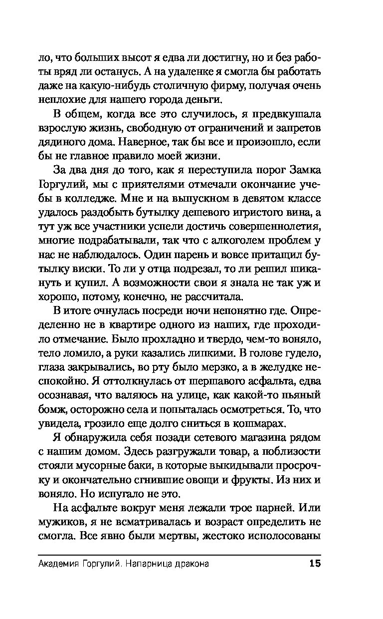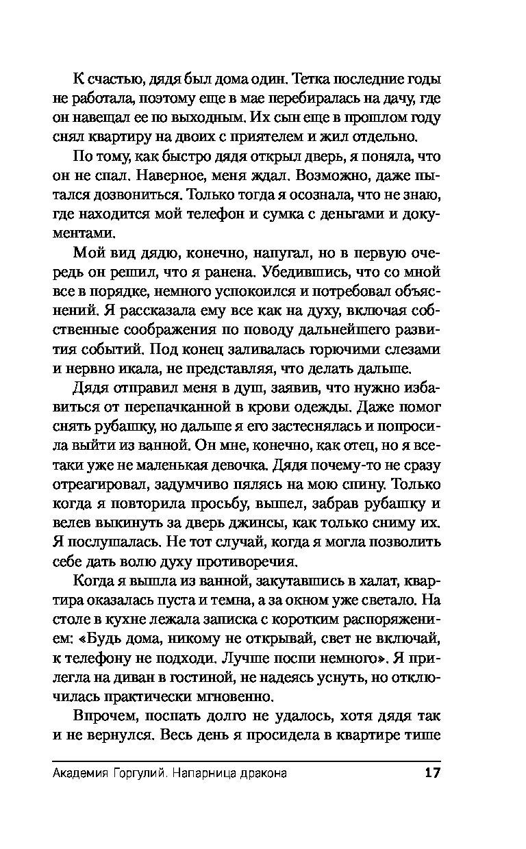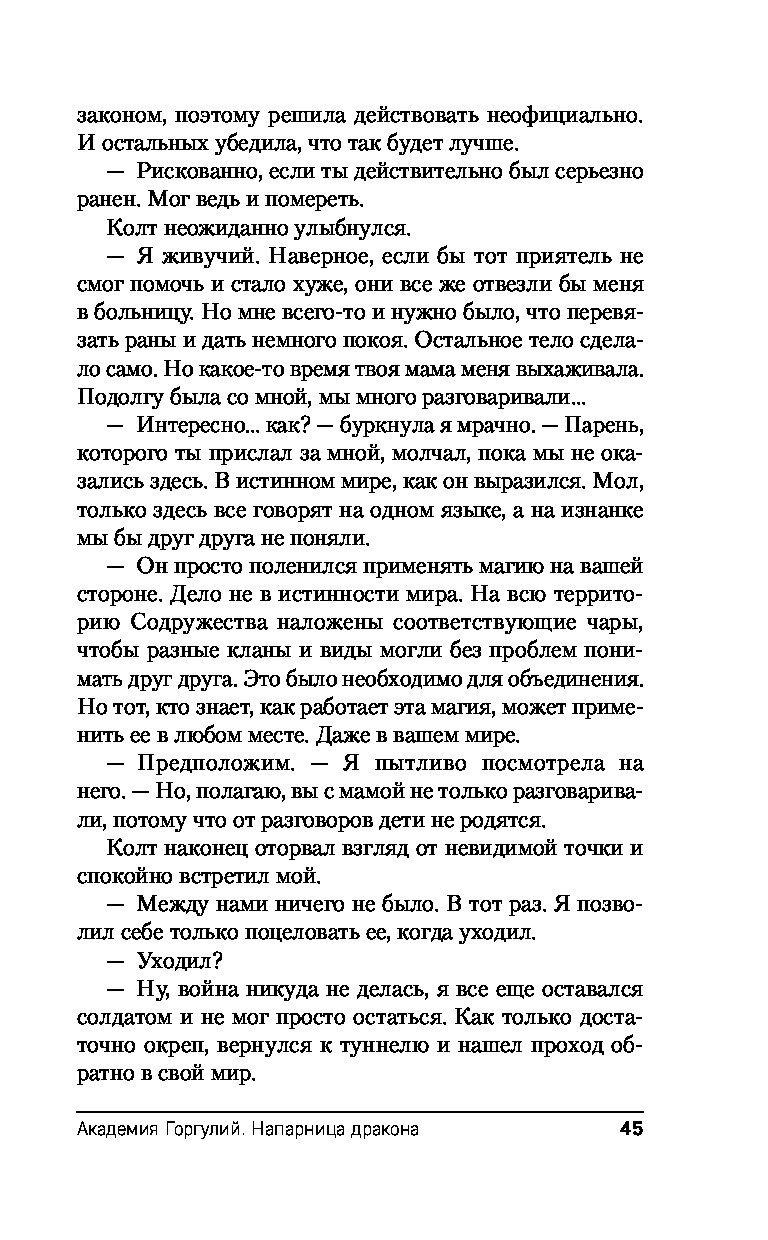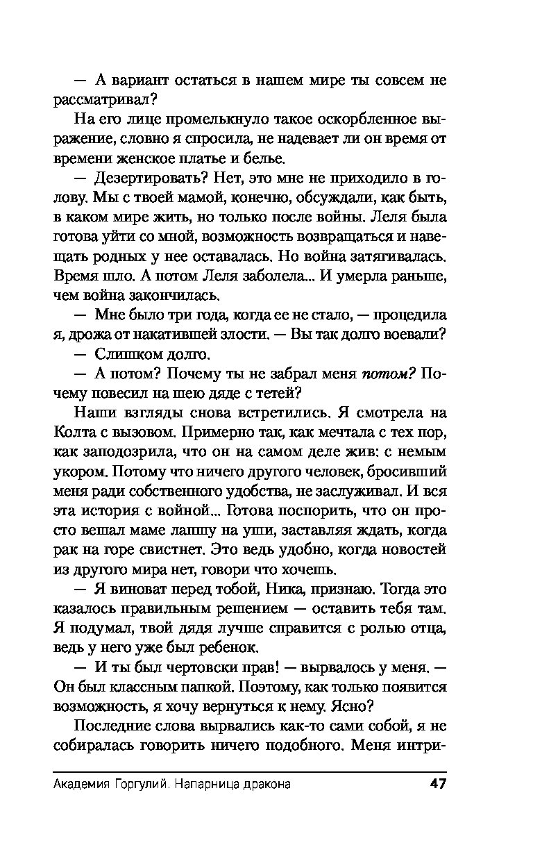«Академия Горгулий. Напарница дракона» — это увлекательный и динамичный роман, в котором героиня из привычной нам реальности попадает в другой мир, в котором существует магия. Ей предстоит разобраться с собственными чувствами, попытаться наладить отношения с отцом и не влюбиться в красивого преподавателя, ведь он явно хранит какую-то опасную тайну.