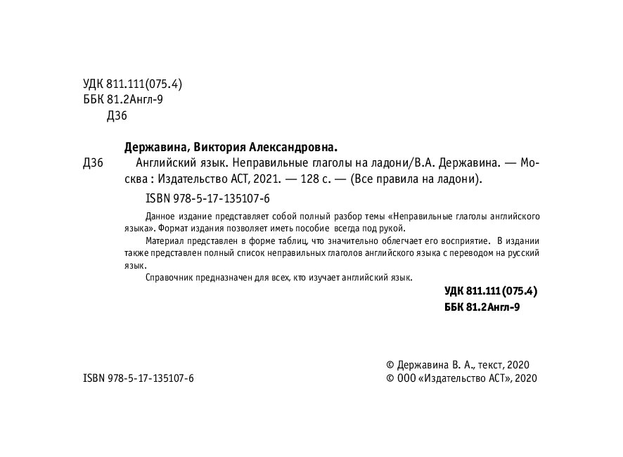 Книга «Английский язык. Неправильные глаголы на ладони» Державина В.А.