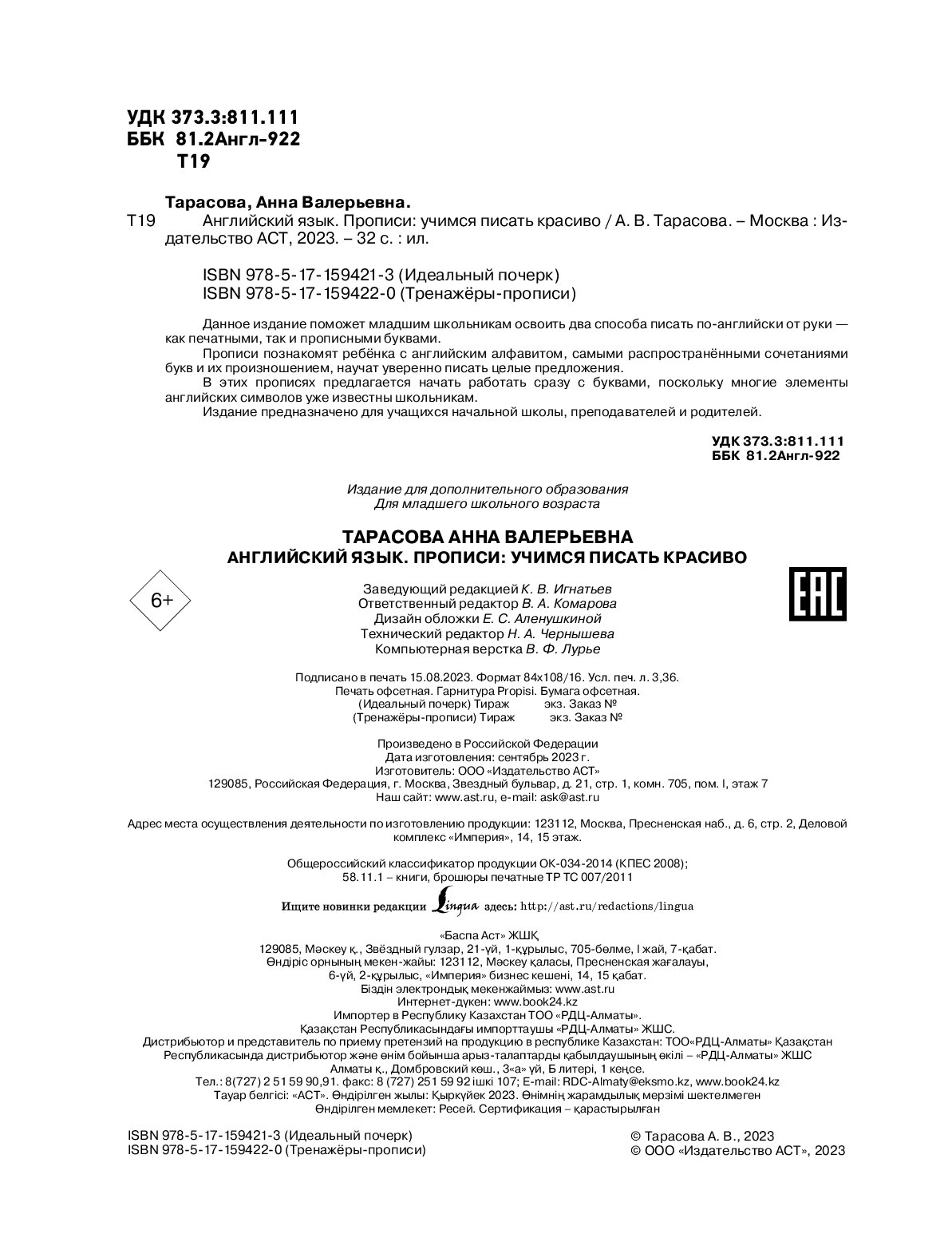 — «Английский язык. Прописи: учимся писать красиво» Тарасова А.В.