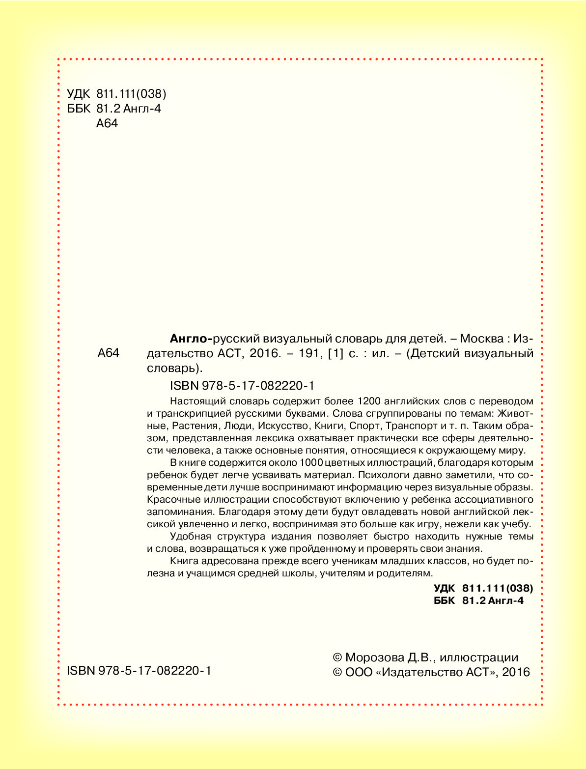 "Англо-русский визуальный словарь" - это отличный помощник в изучении английского языка. В словаре использован метод ассоциативного запоминания, благодаря которому новые слова усваиваются легче и быстрее. В словаре вы найдете:
