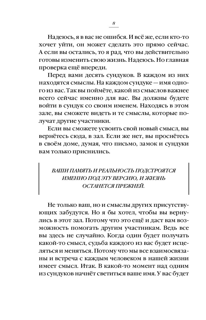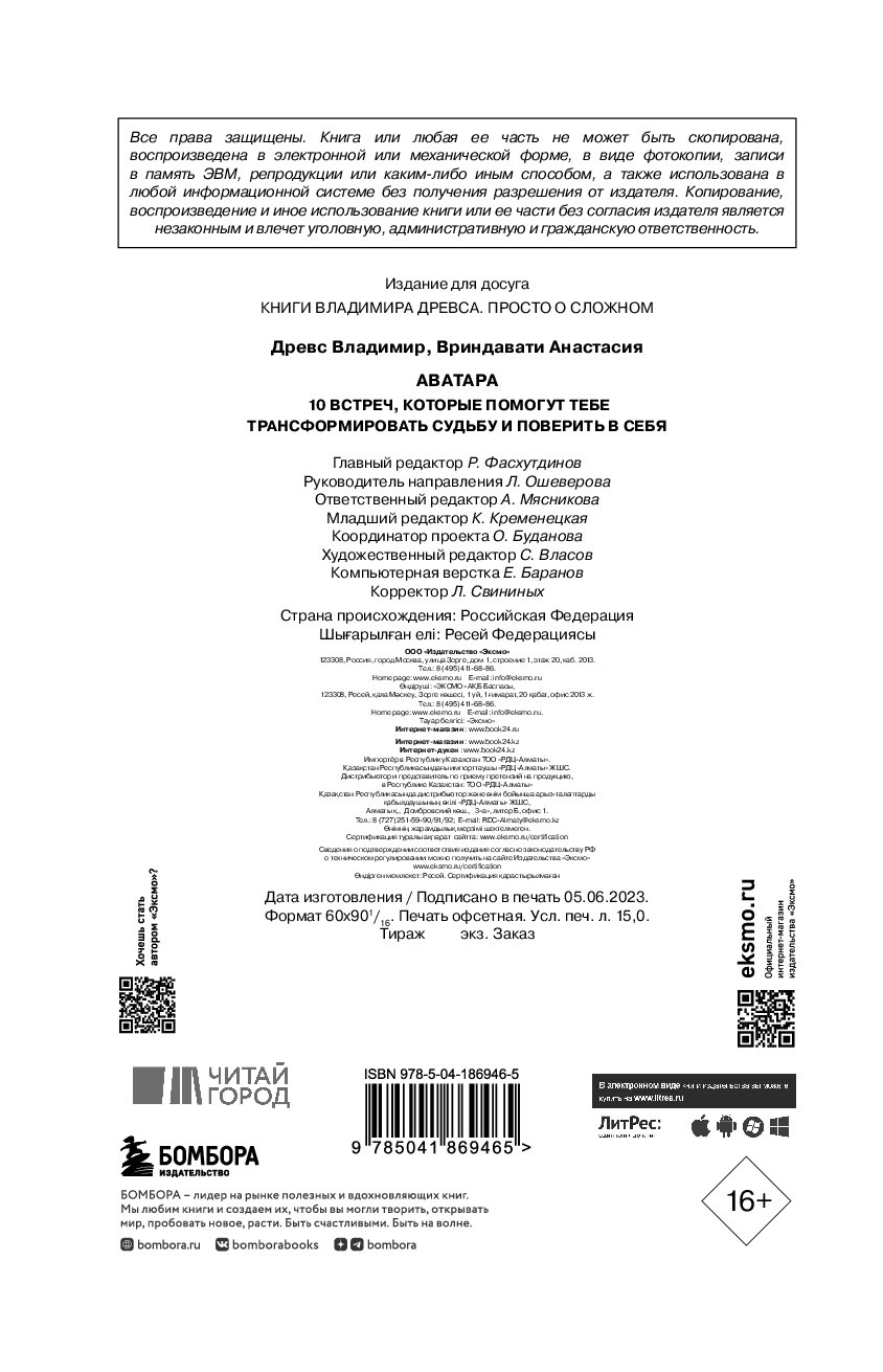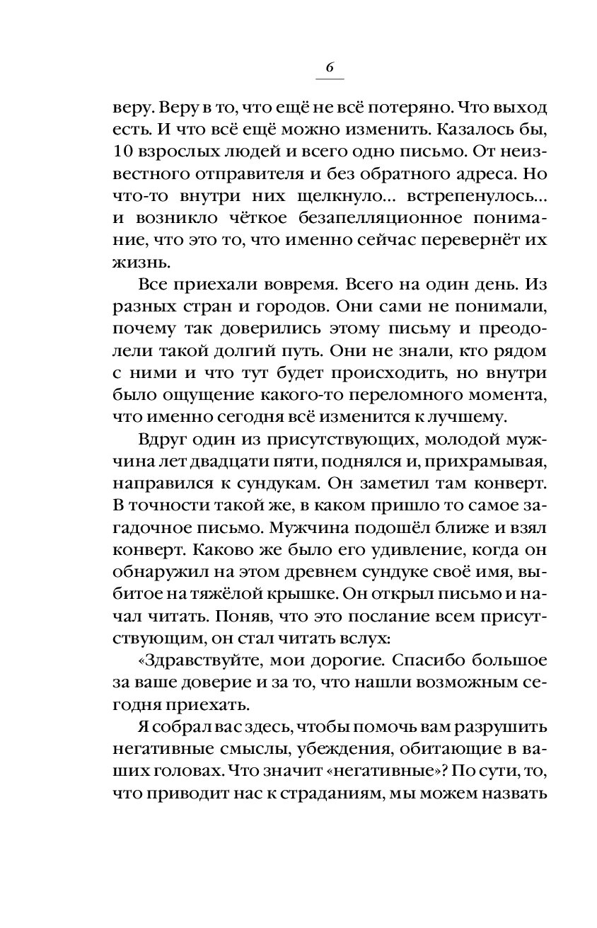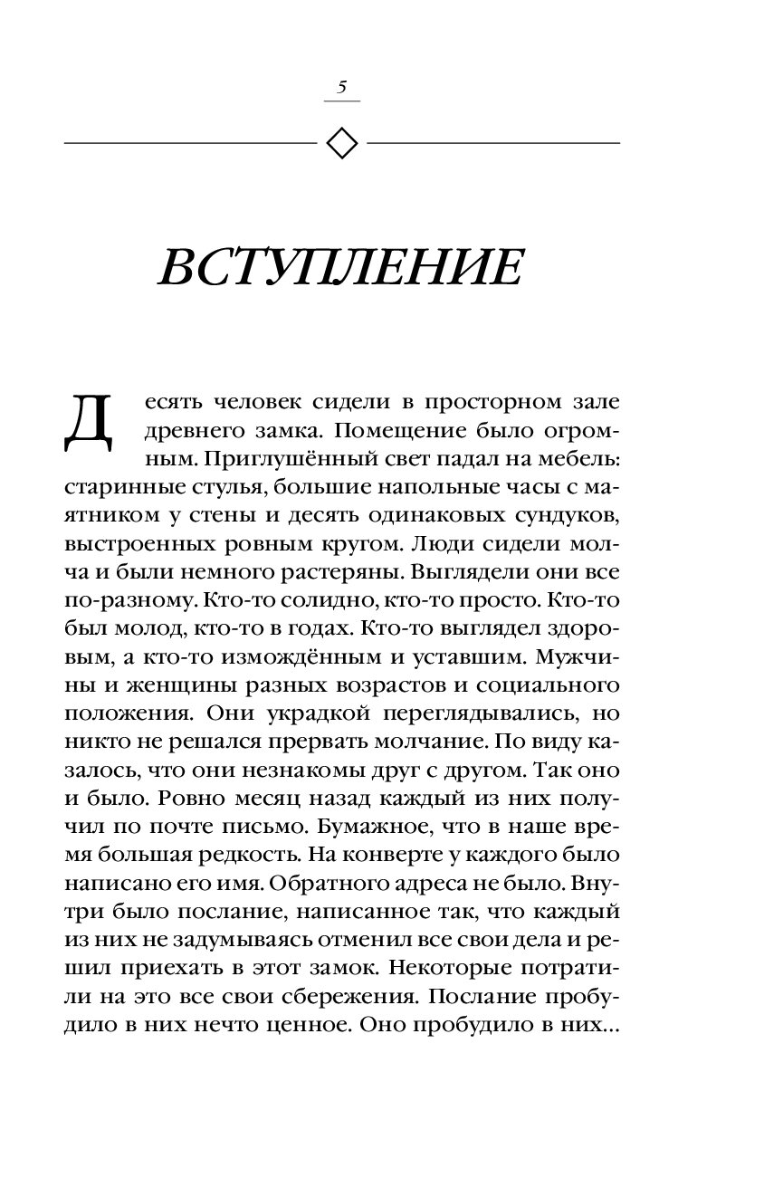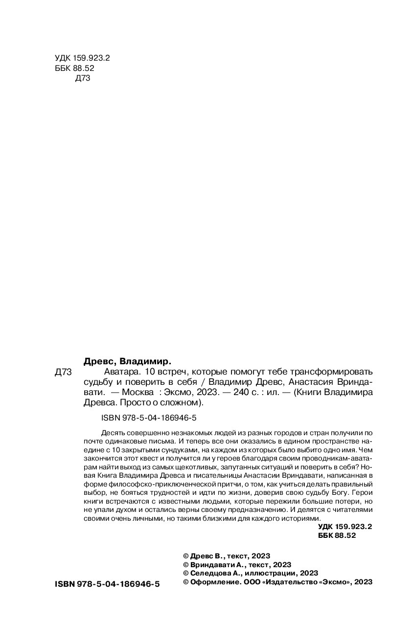 ...Десять совершенно незнакомых людей из разных городов и стран получили по почте одинаковые письма. И теперь все они оказались в едином пространстве наедине с 10 закрытыми сундуками, на каждом из которых было выбито одно имя. Чем закончится этот квест, получится ли у героев благодаря своим проводникам найти выход из самых щекотливых, запутанных ситуаций и поверить в себя? Новая книга Владимира Древса и писательницы Анастасии Вриндавати, написанная в форме философско-приключенческой притчи, о том, как учиться делать правильный выбор, не бояться трудностей и идти по жизни, доверив свою судьбу Богу, и кто же такая Аватара, которая регулярно появляется на страницах книги.