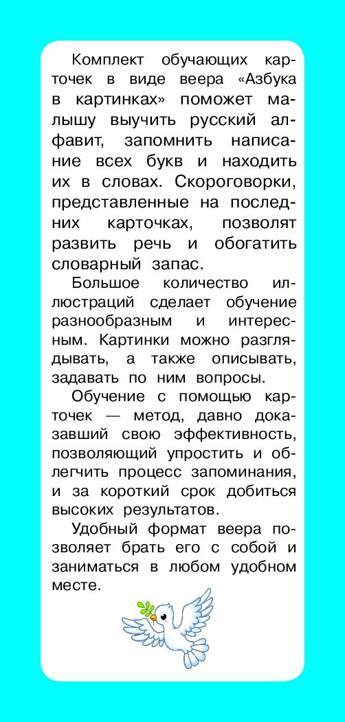 Комплект с карточками в виде веера позволит малышу изучить азбуку: запомнить написание всех букв и находить их в словах. Скороговорки, представленные на последних карточках — идеально для развития речи и обогащения словарного запаса.