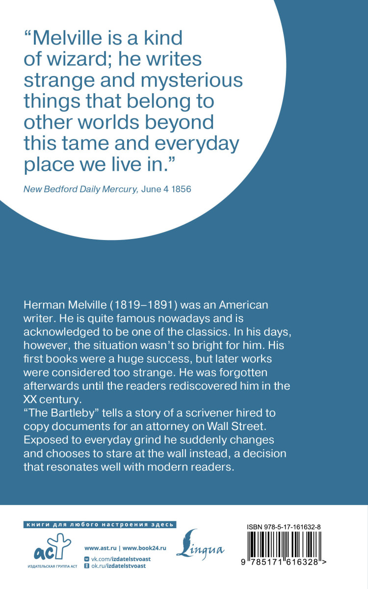 В интернет-магазине Book24.kz можно заказать и купить книгу Bartleby, The Scrivener недорого с адресной доставкой по Казахстану. Воспользовавшись нашим сервисом, Вам не придется долго ждать заказ. В течение 1-9 дней товар доставляется в любой город – Актау, Актобе, Атырау, Караганду, Кокшетау, Костанай, Кызылорду, Павлодар, Петропавловск, Талдыкорган, Тараз, Уральск, Усть-Каменогорск, Шымкент, Алматы, Астану и другие. У нас на сайте можно просмотреть фото, ознакомиться с кратким содержанием книги и отзывами читателей. Предлагаем выгодные условия продажи: доступные цены, оперативную доставку. Все книги в наличии.