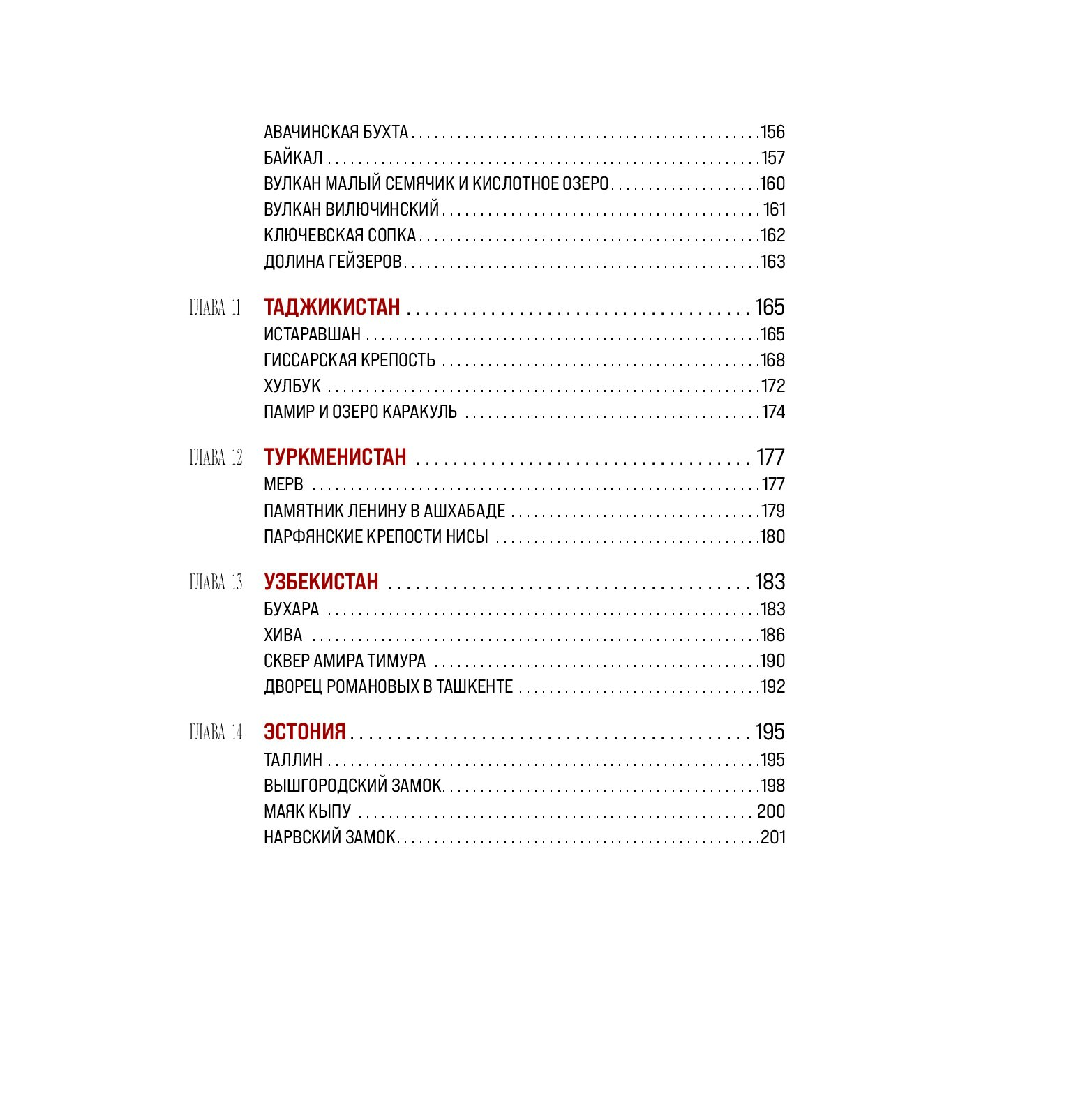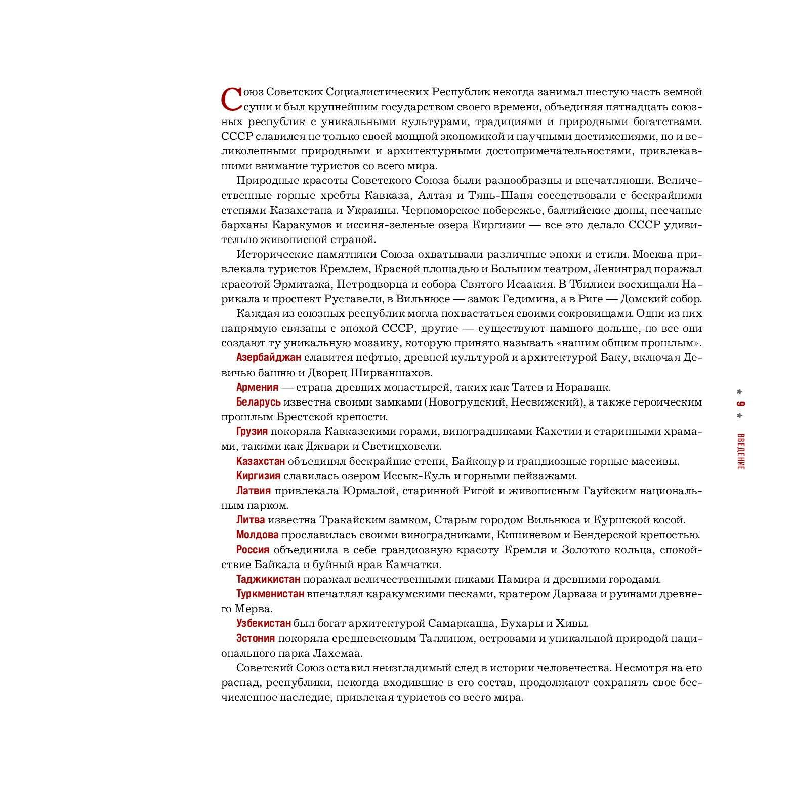 Эта книга — захватывающее приключение по стране, оставившей грандиозный след в культуре, архитектуре и сознании миллионов людей. Вас ждут самые красивые и удивительные места — от ледяных просторов Памира до величественных мавзолеев Узбекистана, от таинственных крепостей Кавказа до легендарной ВДНХ в сердце Москвы.