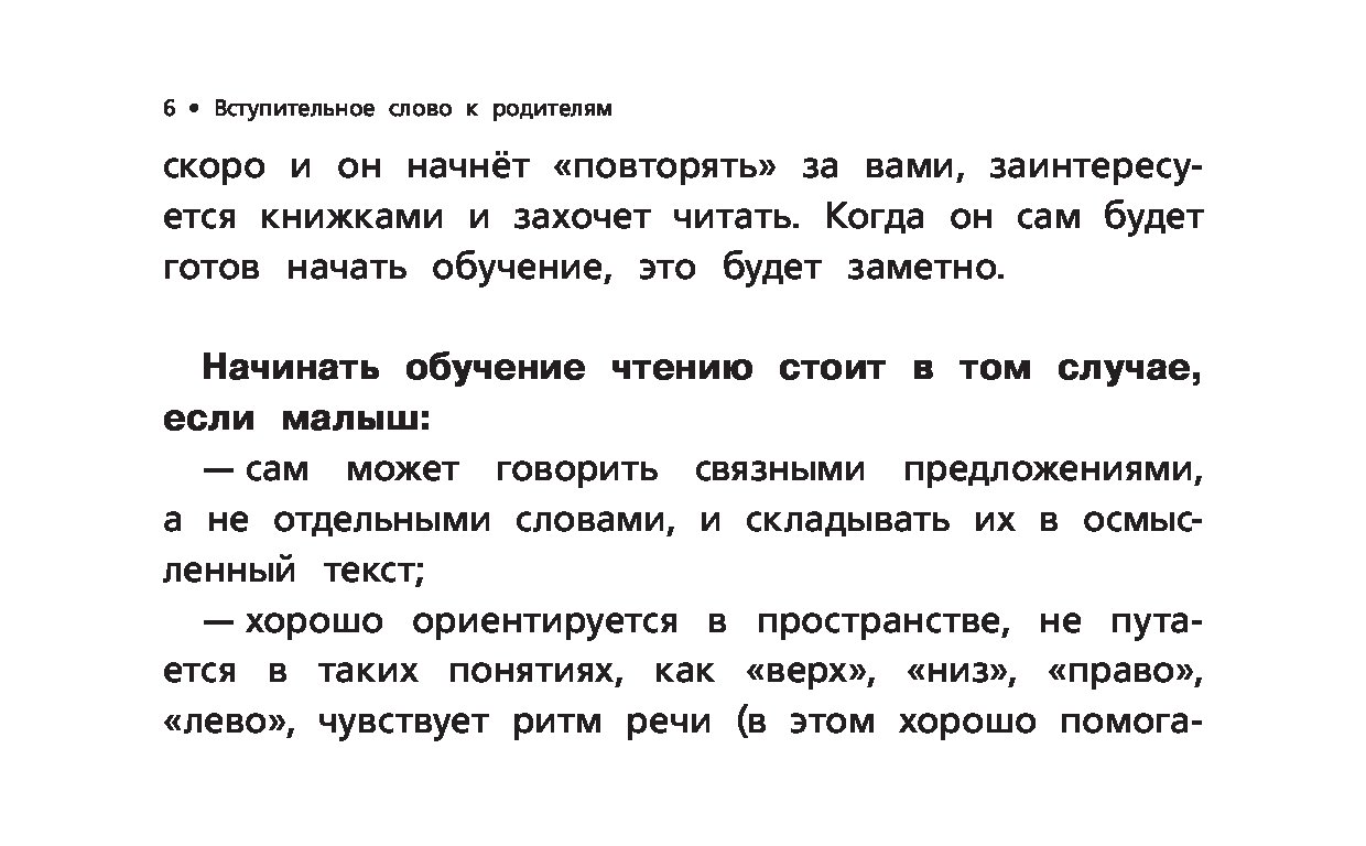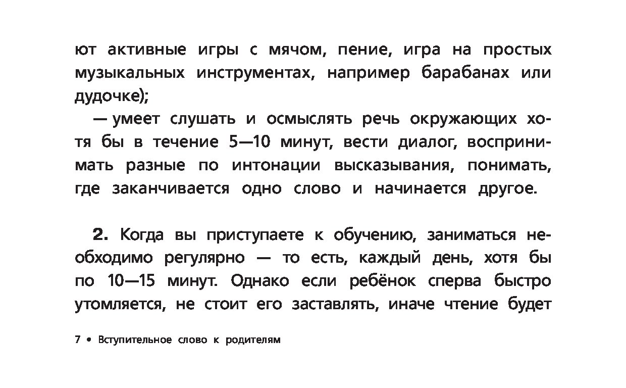Предлагаемое пособие поможет развить навыки чтения у ребёнка. В вводной части даются практические советы и рекомендации для родителей, последующие 3 раздела включают различные текстовые материалы (от простых фраз до небольших сказок), а в заключительной части книги помещены стишки, потешки, считалочки.