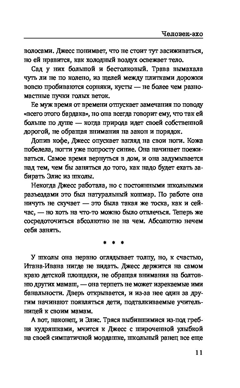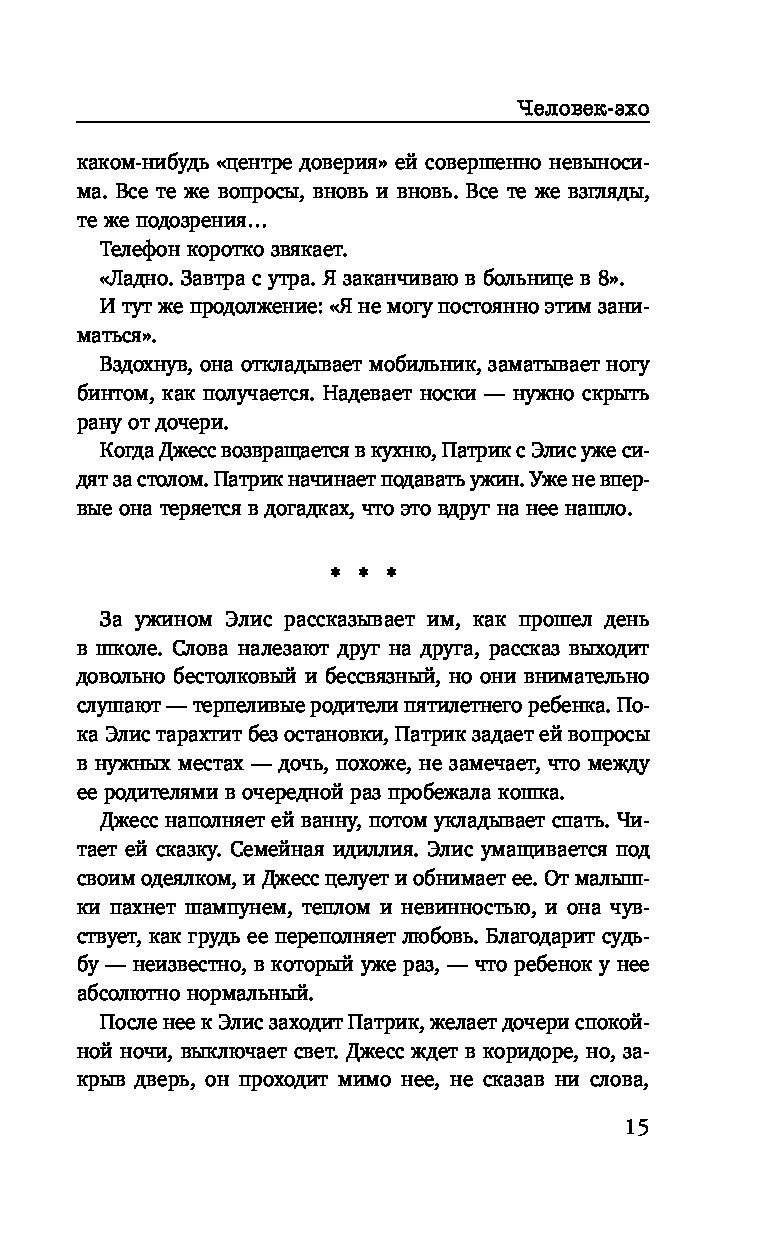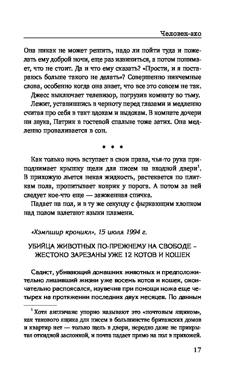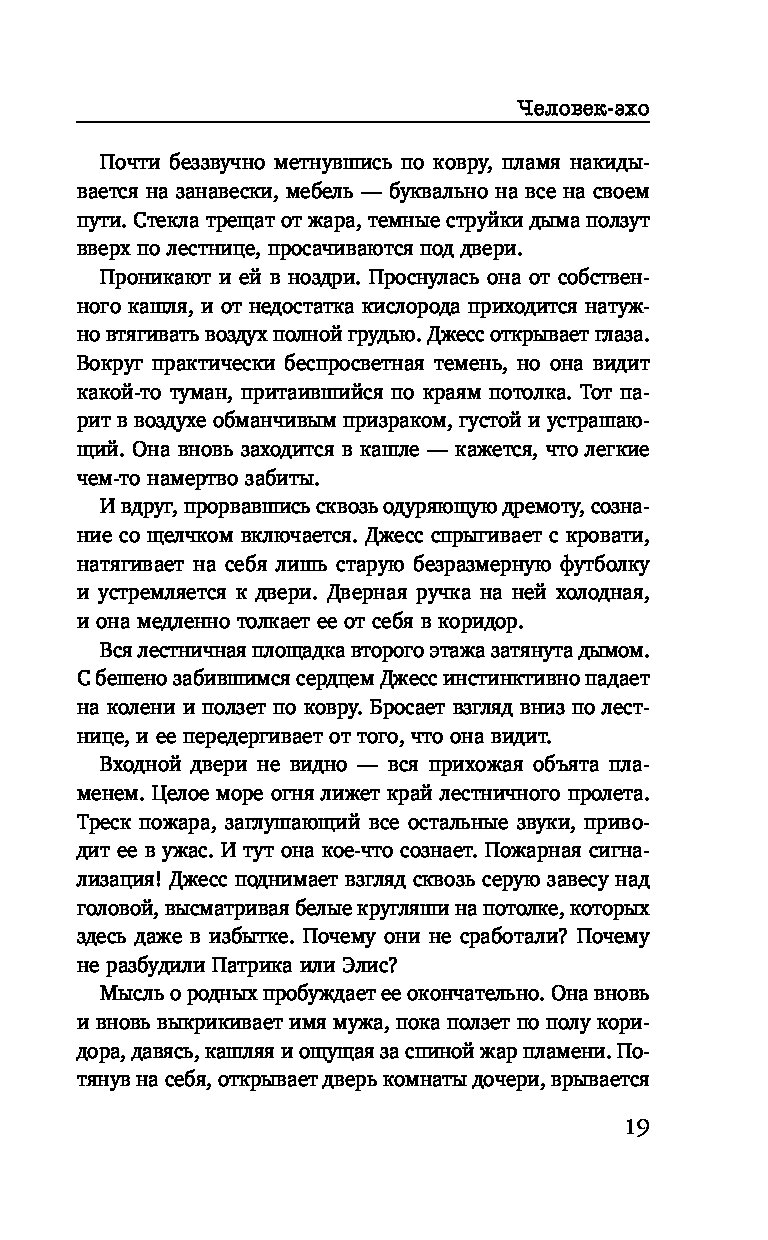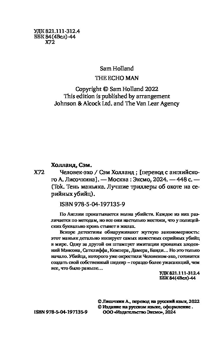 Вскоре детективы обнаруживают жуткую закономерность: этот маньяк детально копирует самых известных серийных убийц в мире. Одну за другой он штампует имитации кровавых злодеяний Мэнсона, Сатклиффа, Кемпера, Дамера, Банди… Но это только начало. Убийца, которого уже окрестили Человеком-эхо, готовится создать свой собственный шедевр — гораздо более ужасающий, чем все, что было раньше…