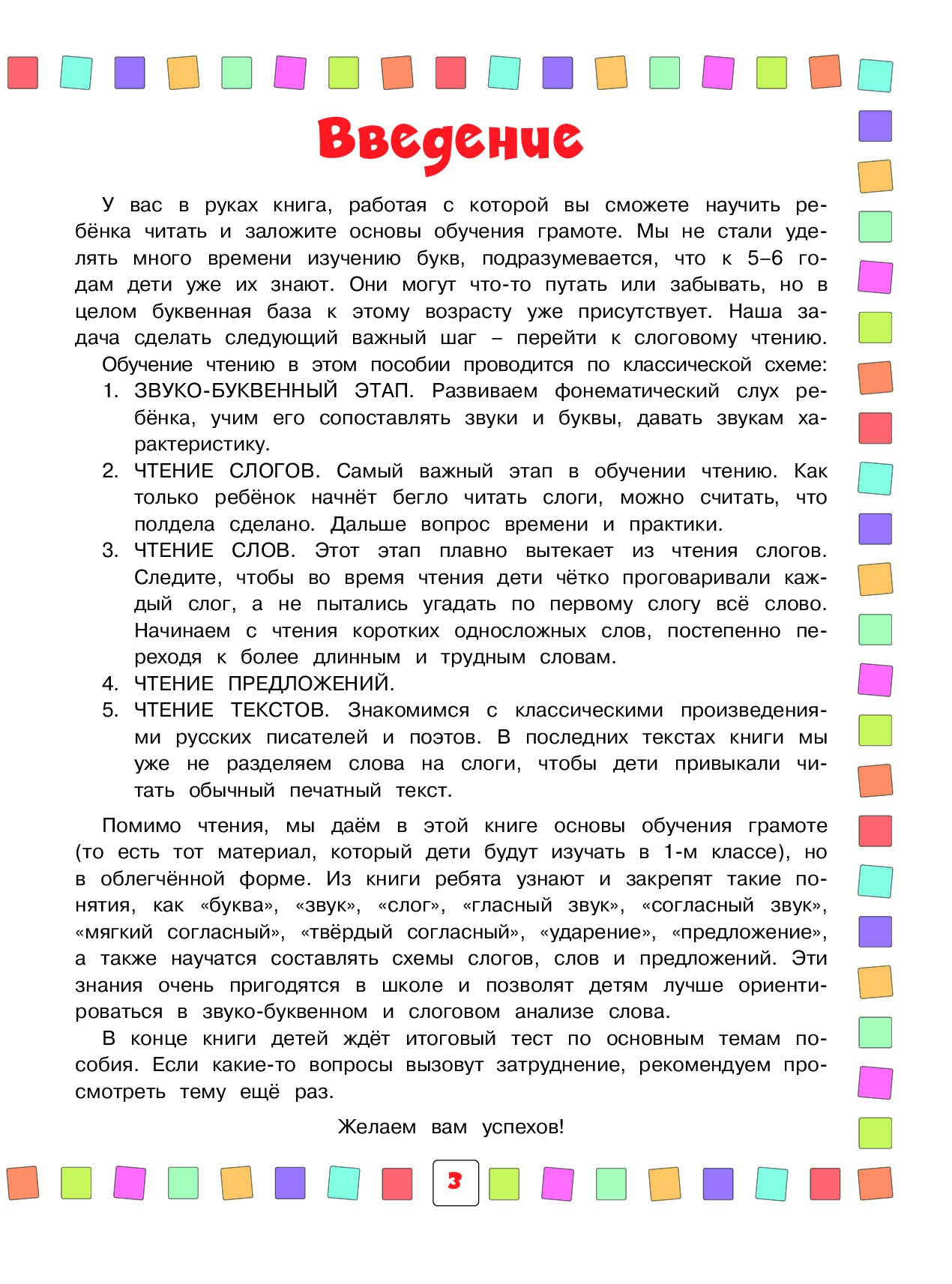 Занимаясь по книге, ребенок научится читать и понимать прочитанное, расширит словарный запас и кругозор, разовьет речь и воображение. Все эти навыки позволят ему успешно учиться в школе.