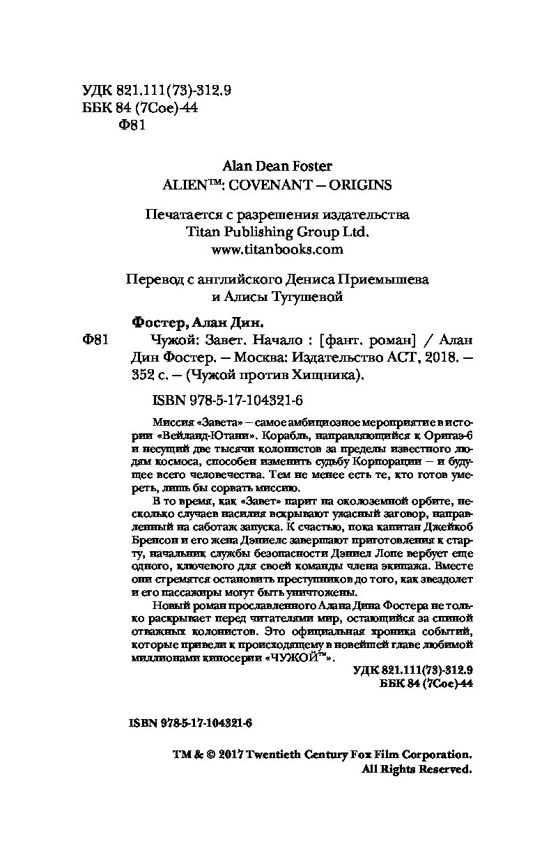 Книга «Чужой. Завет: Начало» Фостер А.Д.