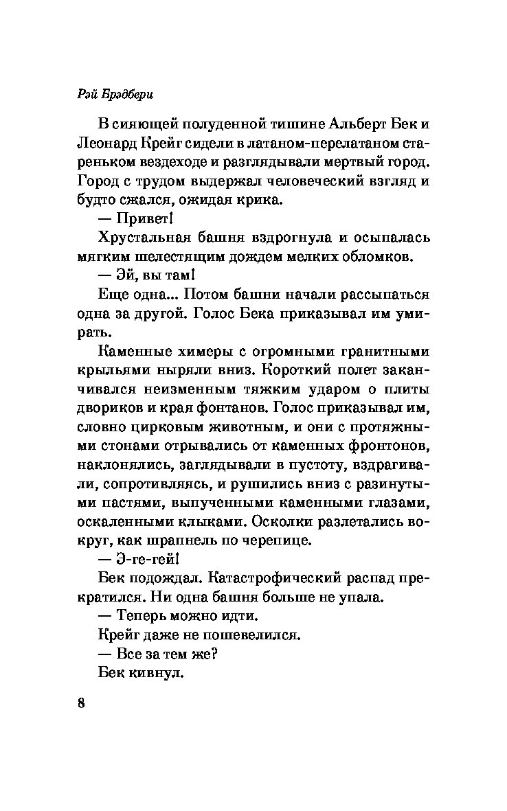 Создатель таких хрестоматийных шедевров, как "Марсианские хроники", "Вино из одуванчиков", "451 по Фаренгейту" . Лауреат многих литературных премий. Это Рэй Брэдбери. Магический реализм его прозы, рукотворные механизмы радости, переносящие человека из настоящего в волшебные миры детства, чудо приобщения к великой тайне Литературы, щедро раздариваемое читателю, давно вывели Рэя Брэдбери на классическую орбиту.