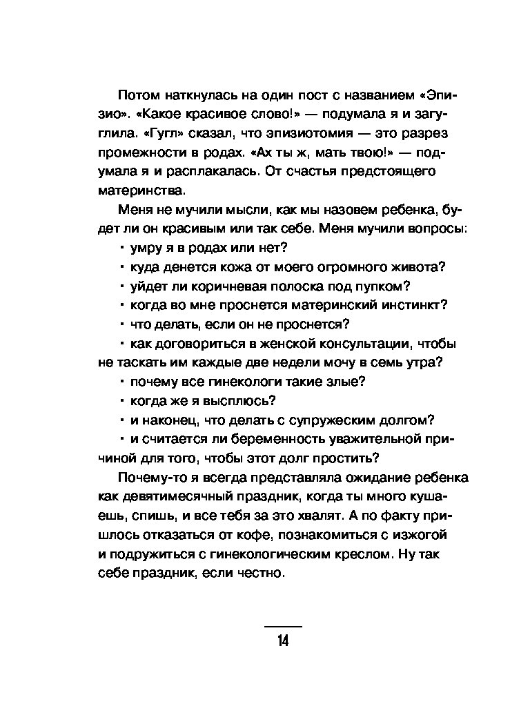 1.    Книга окажется полезной как для родителей, так и для тех, кому предстоит ими стать. Живой, бодрый и ироничный язык – читается на одном дыхании. Огромное количество нюансов в жизни в роли мамы. Откровенно о самом сложном периоде для женщины. Забавные иллюстрации, которые поймет каждый.
