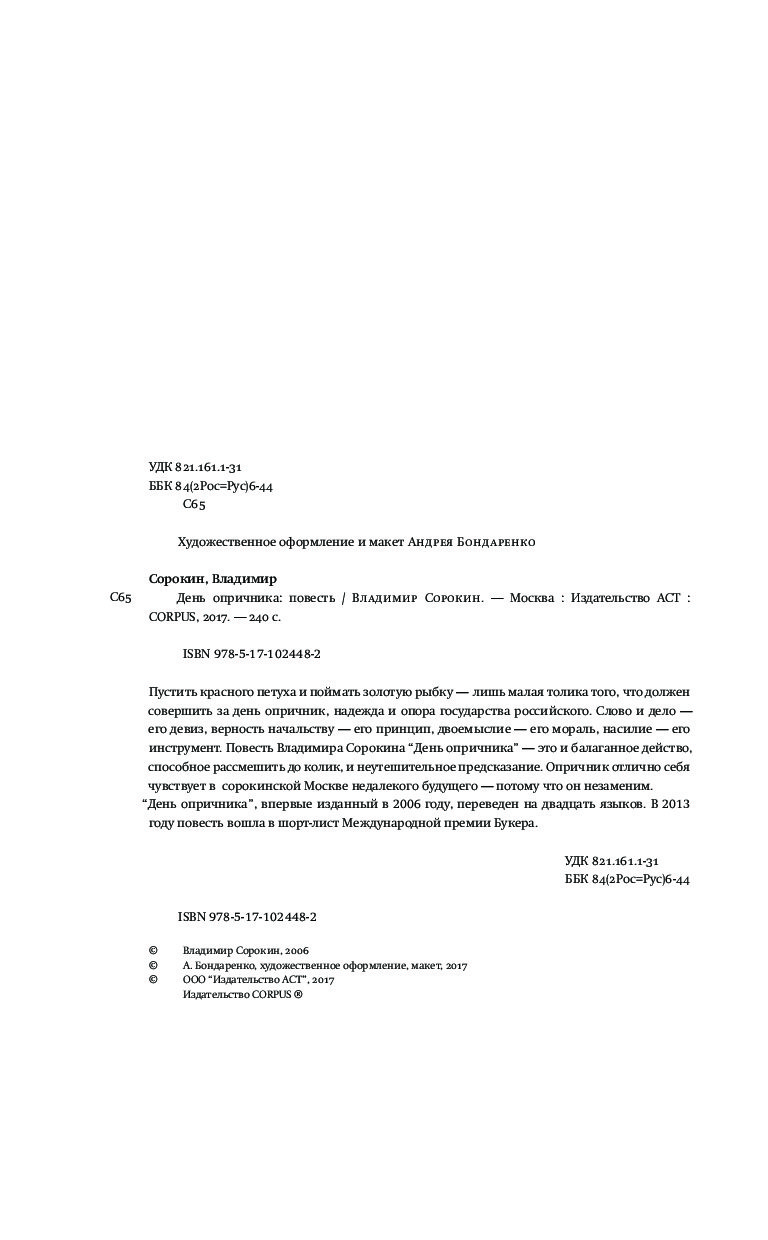 В интернет-магазине Book24.kz можно купить книгу День опричника с адресной доставкой по РК. Наш сервис – это прекрасная возможность сэкономить деньги и время, ведь вам не придется искать необходимое издание в обычных книжных магазинах. К тому же, мы предлагаем книгу [название книги] недорого. Доступные цены сохраняем за счет того, что напрямую сотрудничаем с издательствами. Вы без труда можете заказать интересующую книгу в Алматы, Астану, Актау, Актобе, Атырау, Караганду, Кокшетау, Костанай, Кызылорду, Павлодар, Петропавловск, Талдыкорган, Тараз, Уральск, Усть-Каменогорск, Шымкент, и другие города. Чтобы оформить заказ, нужно связаться с нашим менеджером по телефону или заполнить заявку онлайн.