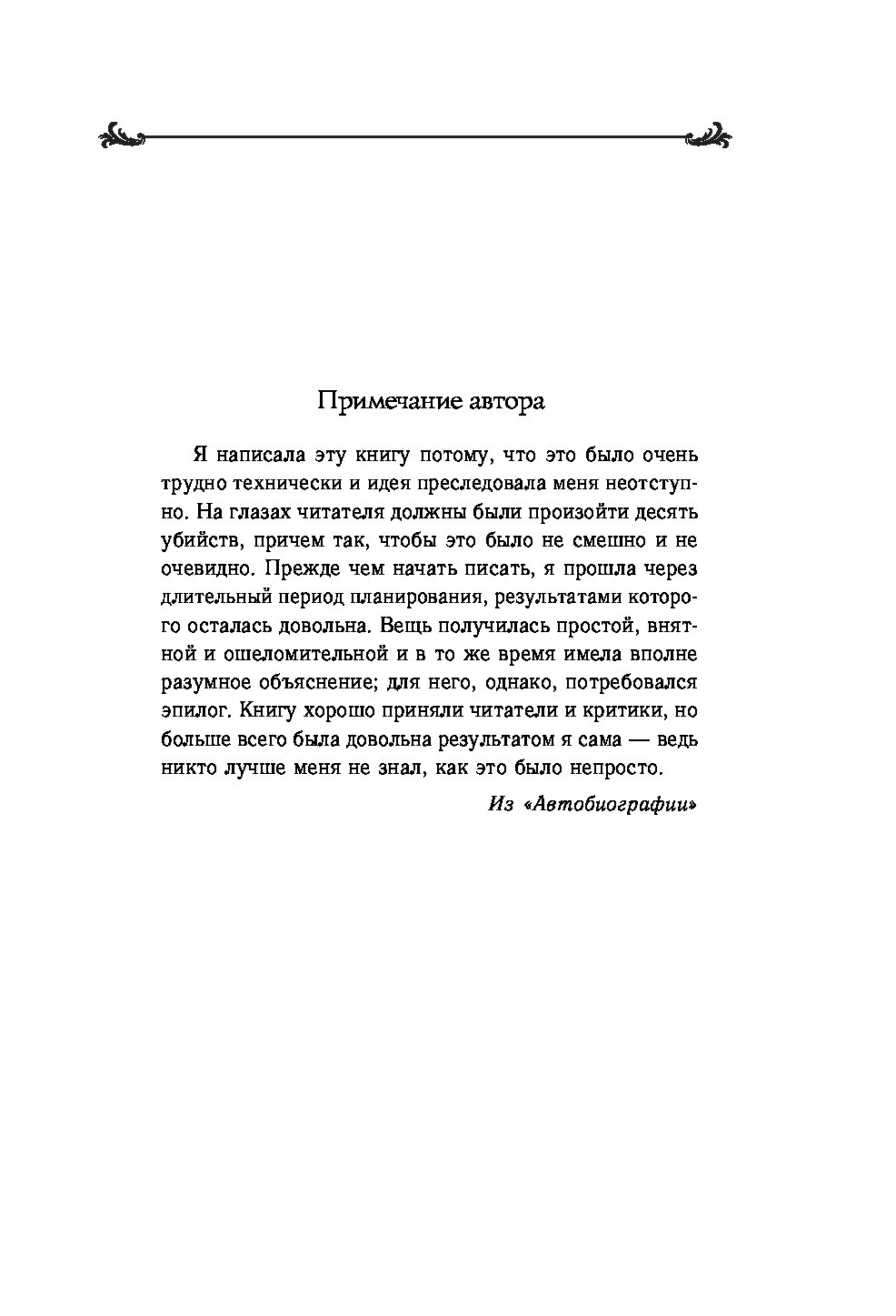 Агата Кристи — самый публикуемый автор всех времен и народов после Шекспира. Тиражи ее книг уступают только тиражам его произведений и Библии. В мире продано больше миллиарда книг Кристи на английском языке и столько же — на других языках. Она автор восьмидесяти детективных романов и сборников рассказов, двадцати пьес, двух книг воспоминаний и шести психологических романов, написанных под псевдонимом Мэри Уэстмакотт. Ее персонажи Эркюль Пуаро и мисс Марпл навсегда стали образцовыми героями остросюжетного жанра.