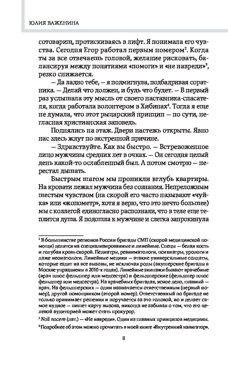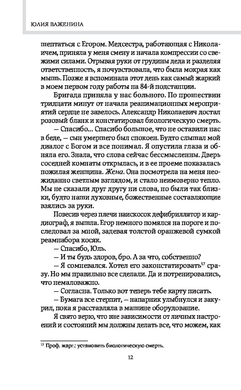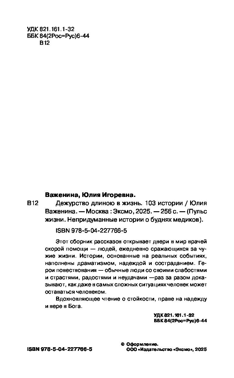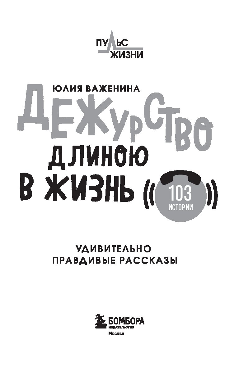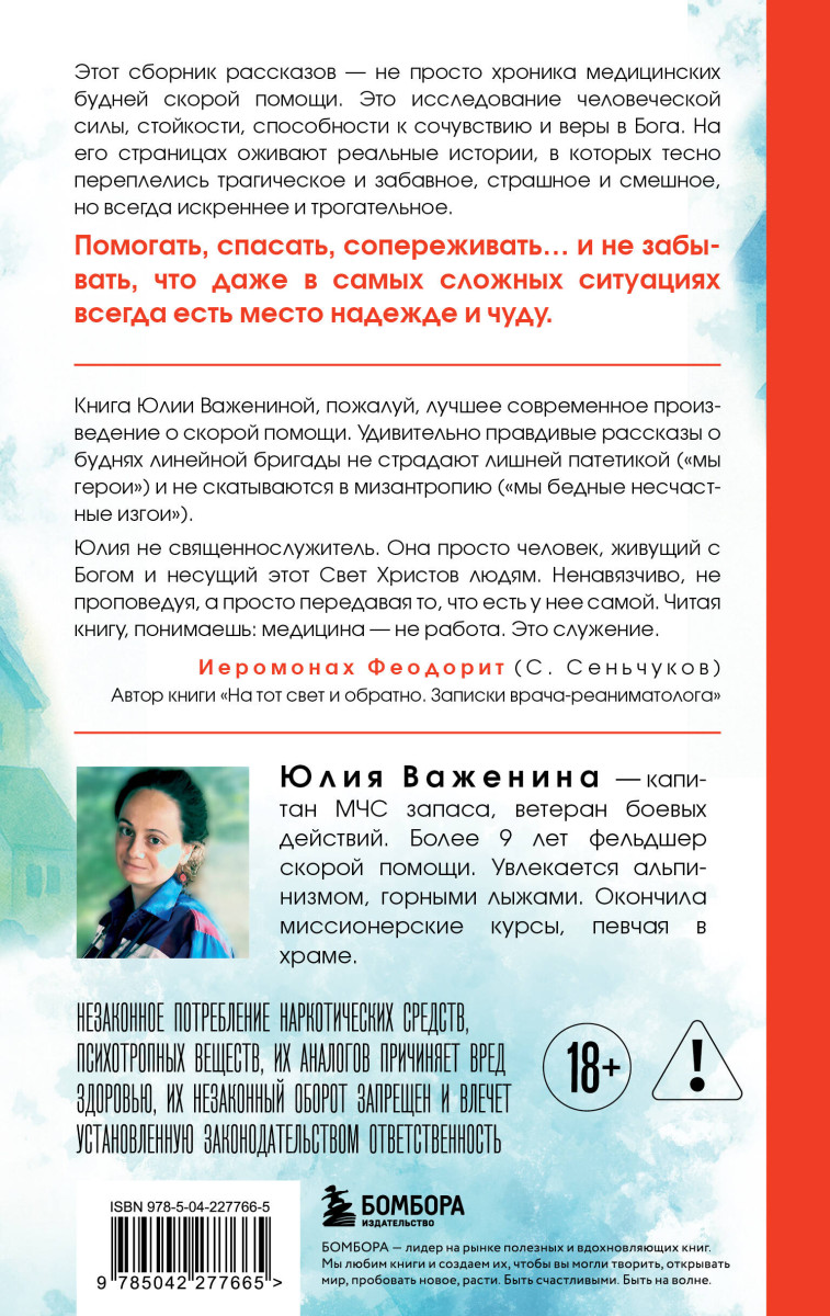 103 — цифры, способные спасти чью-то жизнь. Удивительно правдивые рассказы о буднях скорой помощи создала Юлия Важенина — начинающий автор, капитан МЧС запаса, ветеран боевых действий, более 9 лет фельдшер скорой помощи. Ей хорошо известно, что ежедневно врачи сталкиваются с вопросами, выходящими далеко за рамки медицины, и как оставаться человеком даже в самых сложных ситуациях.