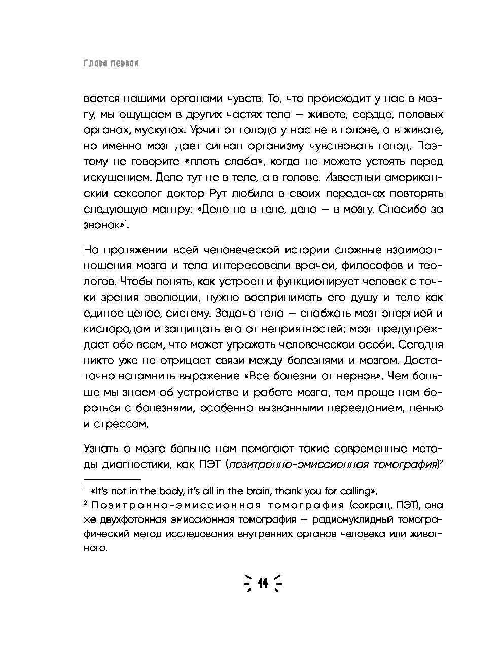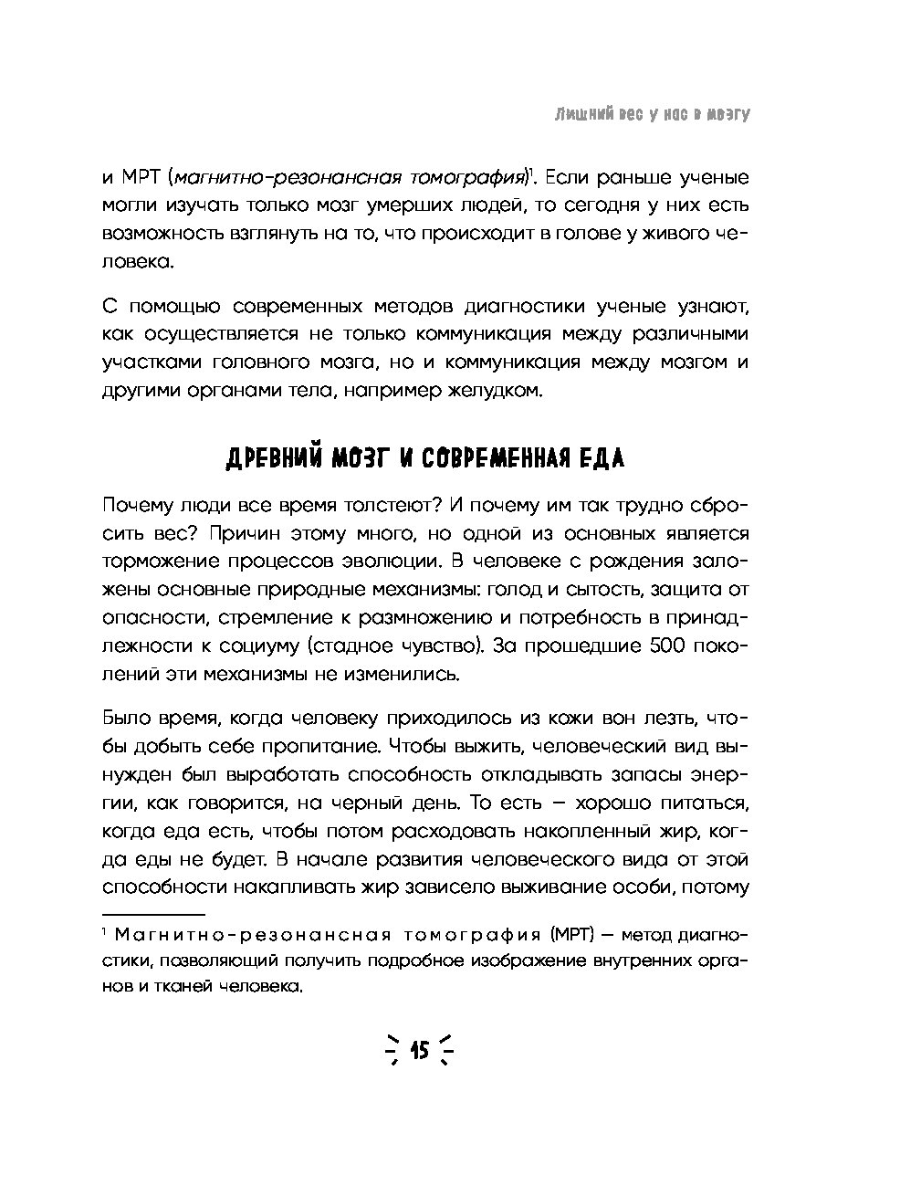 И единственное, что, как мы думаем, помогает, - это меньше есть и больше двигаться. Но на самом деле все не так просто. Путь к успешному и устойчивому контролю веса проходит через мозг. Этот орган играет главную роль в процессах еды и питья. Система вознаграждений мозга - это невидимая сверхдержава, которая контролирует наши действия во имя добра и зла, и которая предпочитает пищу, повышающую уровень сахара в крови и дающую нам мгновенный удар силы и бодрости.