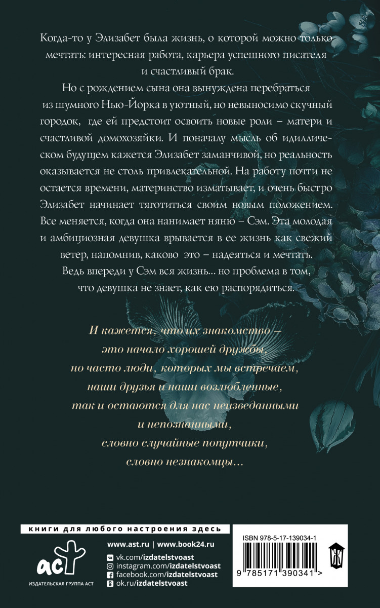 Элизабет — знаменитая писательница, недавно ставшая матерью и переехавшая из шумного Нью-Йорка в провинциальный городок. Теперь на работу у нее почти не остается времени, материнство изматывает — и Элизабет кажется, что теперь ее жизнь будет вечно вращаться вокруг ребенка. Все меняет знакомство с Сэм, амбициозной студенткой колледжа, которая устраивается няней к Элизабет. У нее вся жизнь впереди, вот только девушка не знает, как ею распорядиться.