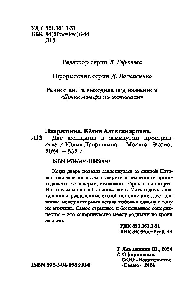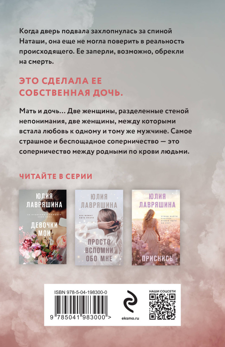 Когда дверь подвала захлопнулась за спиной Наташи, она еще не могла поверить в реальность происходящего. Ее заперли, возможно, обрекли на смерть. И это сделала ее собственная дочь. Мать и дочь… Две женщины, разделенные стеной непонимания, две женщины, между которыми встала любовь к одному и тому же мужчине. Самое страшное и беспощадное соперничество — это соперничество между родными по крови людьми.