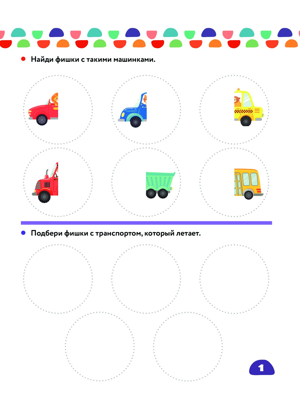 На страничках расположены интересные задания. Чтобы их выполнить, малышу нужно подобрать подходящие фишки с картинками.