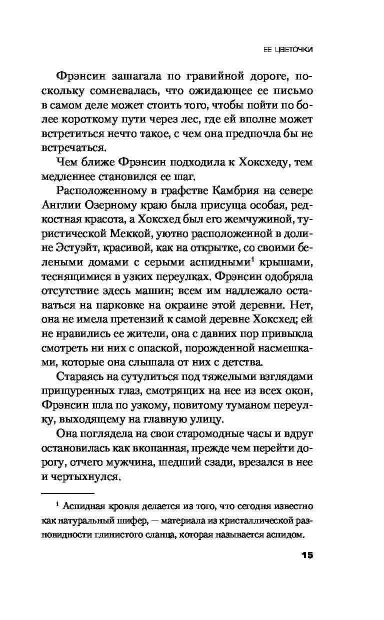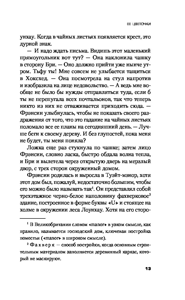 В Хоксхеде, жемчужине английского Озерного края, Фрэнсин Туэйт считают ведьмой. Как и ее покойная мать, она владеет искусством травничества и Языком цветов. Фрэнсин живет в старинной усадьбе, принадлежащей ее семье уже 500 лет. Огромный жуткий дом окружен прекрасным садом. И хотя поблизости нет ни единой живой души, женщина не одинока: у нее есть ее цветы… А еще призраки – они всегда где-то рядом, такие близкие и безобидные. С одним Фрэнсин даже дружит – с девочкой по имени Бри. А вот духам зла здесь не место – и чудодейственные травы и цветы знахарки отгоняют любую напасть. Но однажды зло все же переступает порог ее уединенного дома…