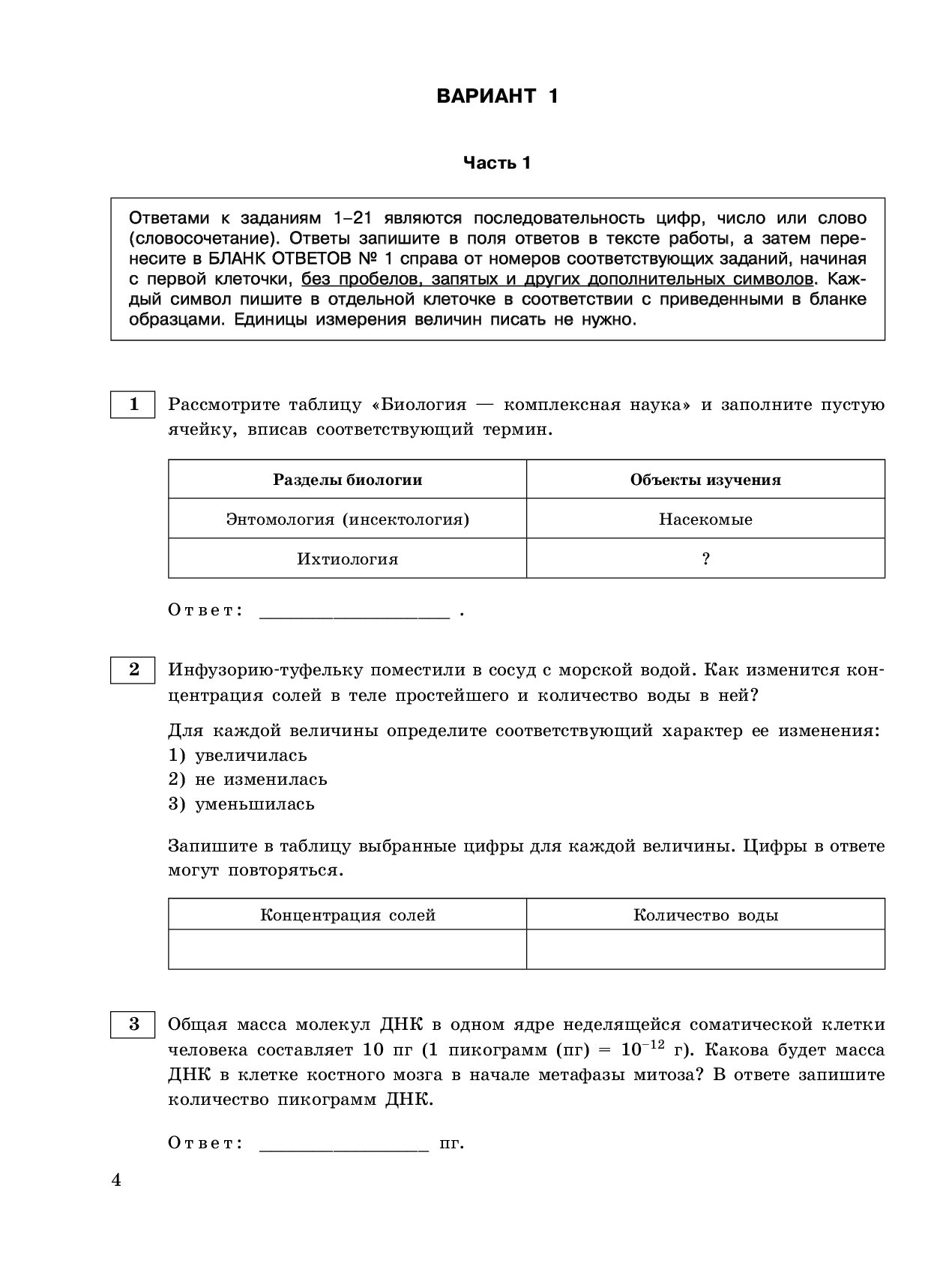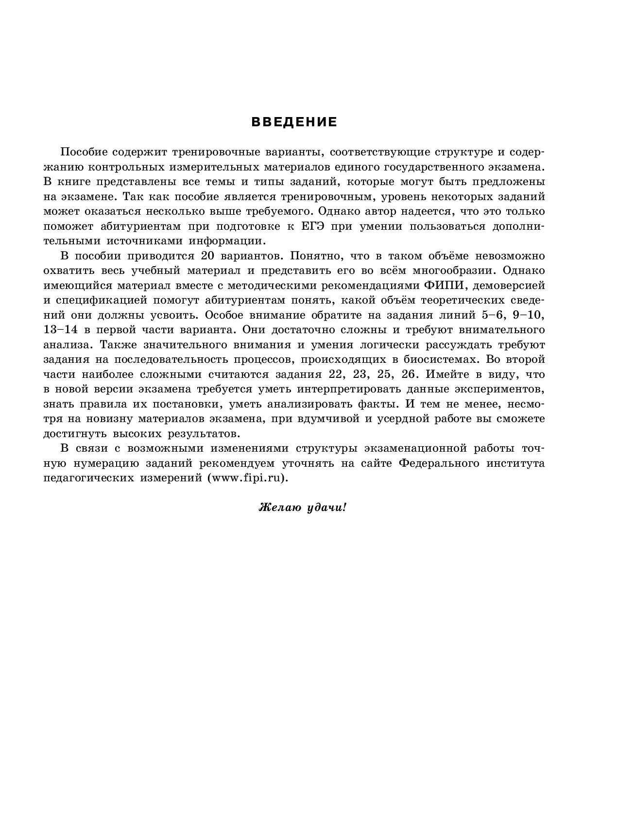 Пособие содержит 20 тренировочных вариантов по биологии, составленных с учетом требований ЕГЭ. Каждый вариант включает задания разных типов и уровней сложности. В конце пособия приводятся ответы.