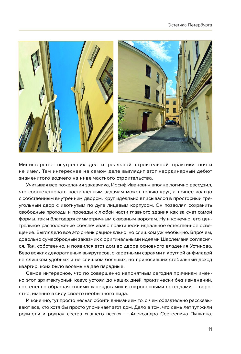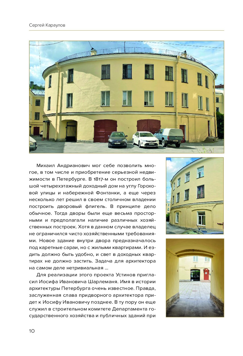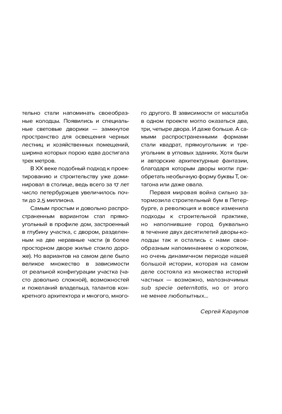 Автор книги, Сергей Караулов, задумал ее как продолжение истории о доходных домах, но дополнил рассказ фотопортретами и занимательной информацией о дворах, которые тоже были свидетелями многих событий. Новая книга соединила в себе прошлое и настоящее: от времен монументального ампира до лихорадки строительного бума начала XX века.