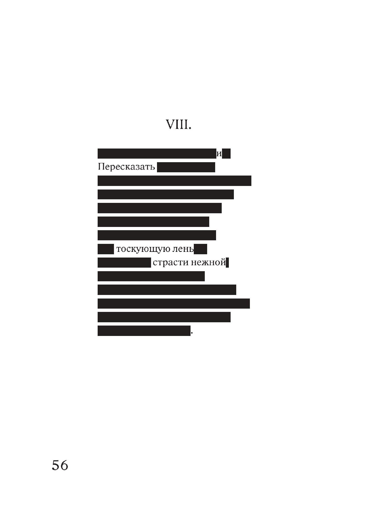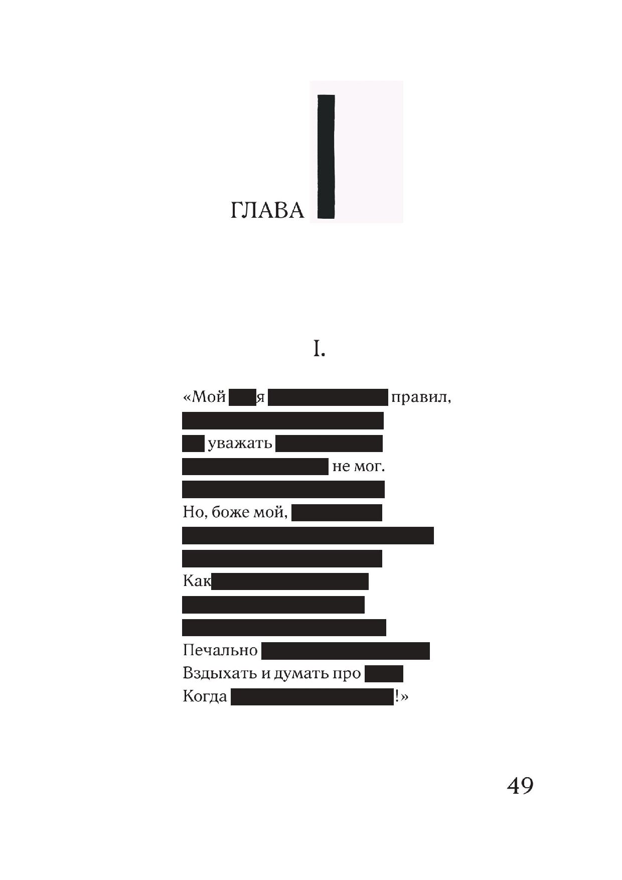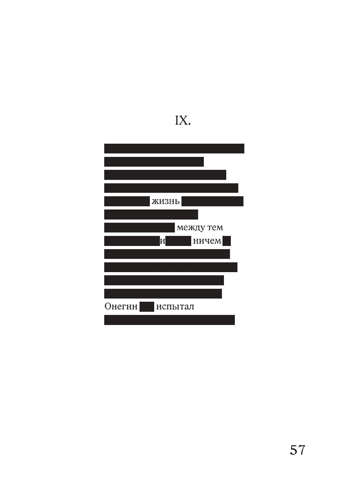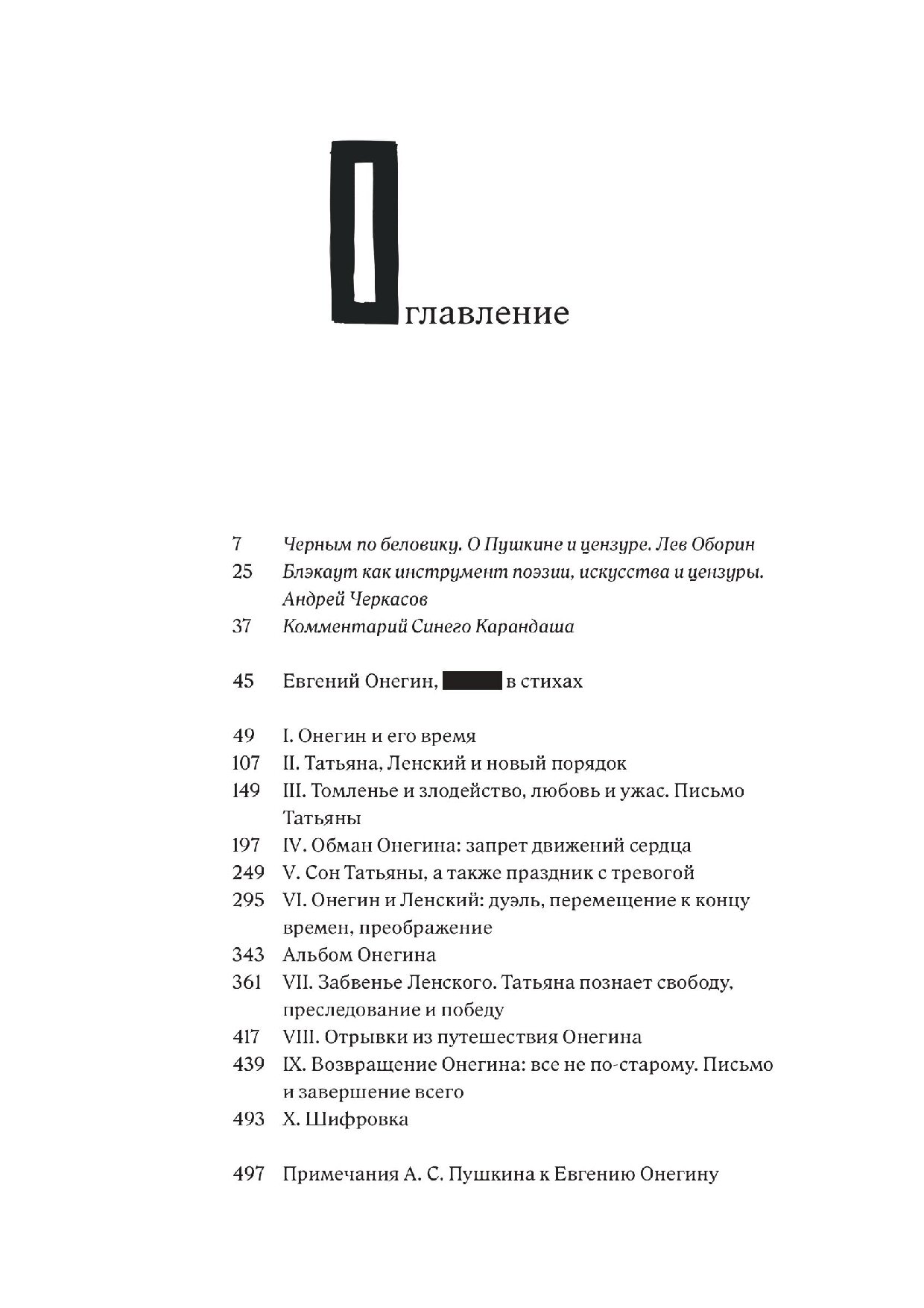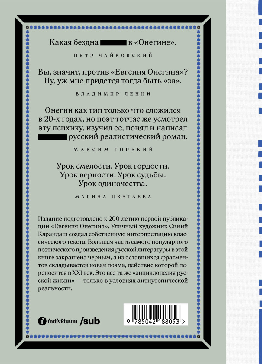 Издание подготовлено к 200-летию первой публикации «Евгения Онегина». Уличный художник Синий Карандаш создал собственную интерпретацию классического текста. Большая часть самого популярного поэтического произведения русской литературы в этой книге закрашена черным, а из оставшихся фрагментов складывается новая поэма, действие которой переносится в XXI век. Это всё та же «энциклопедия русской жизни» — только в условиях антиутопической реальности.