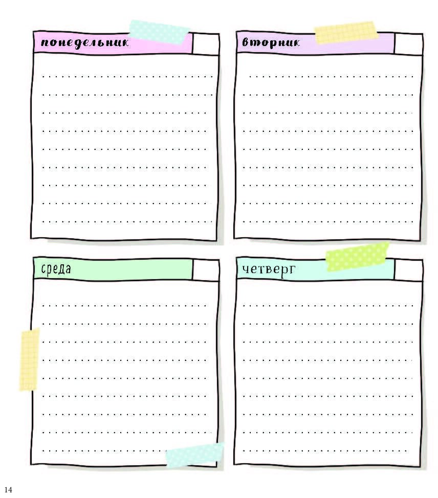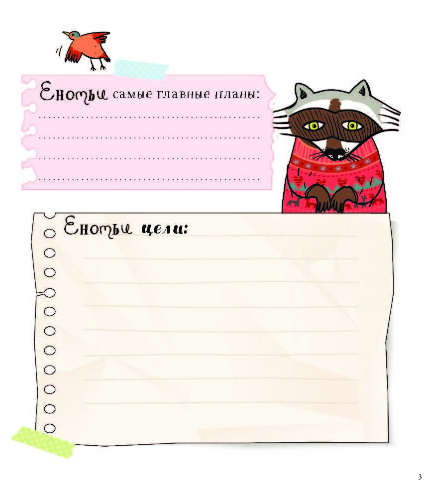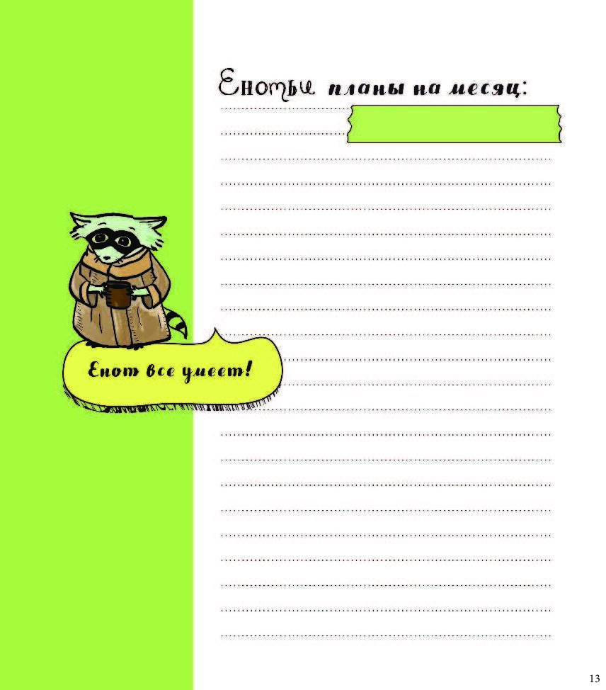 В этом ежедневнике каждая неделя на новом развороте. Распиши все дела на неделю, а потом пораскрашивай енотов в дерзкие цвета на специальных страницах для творчества.
