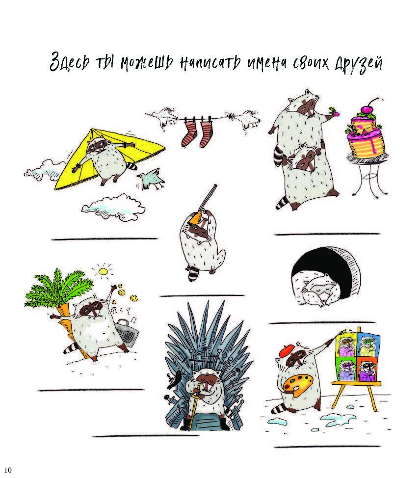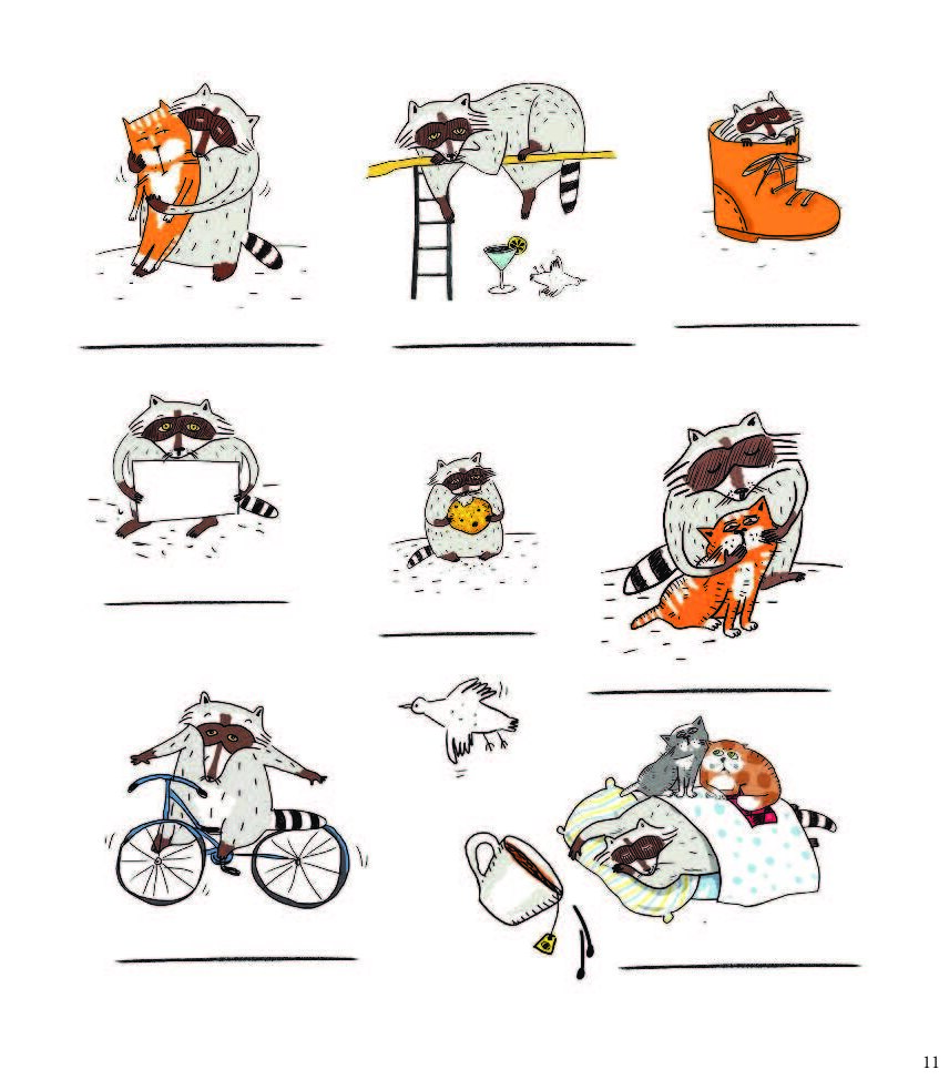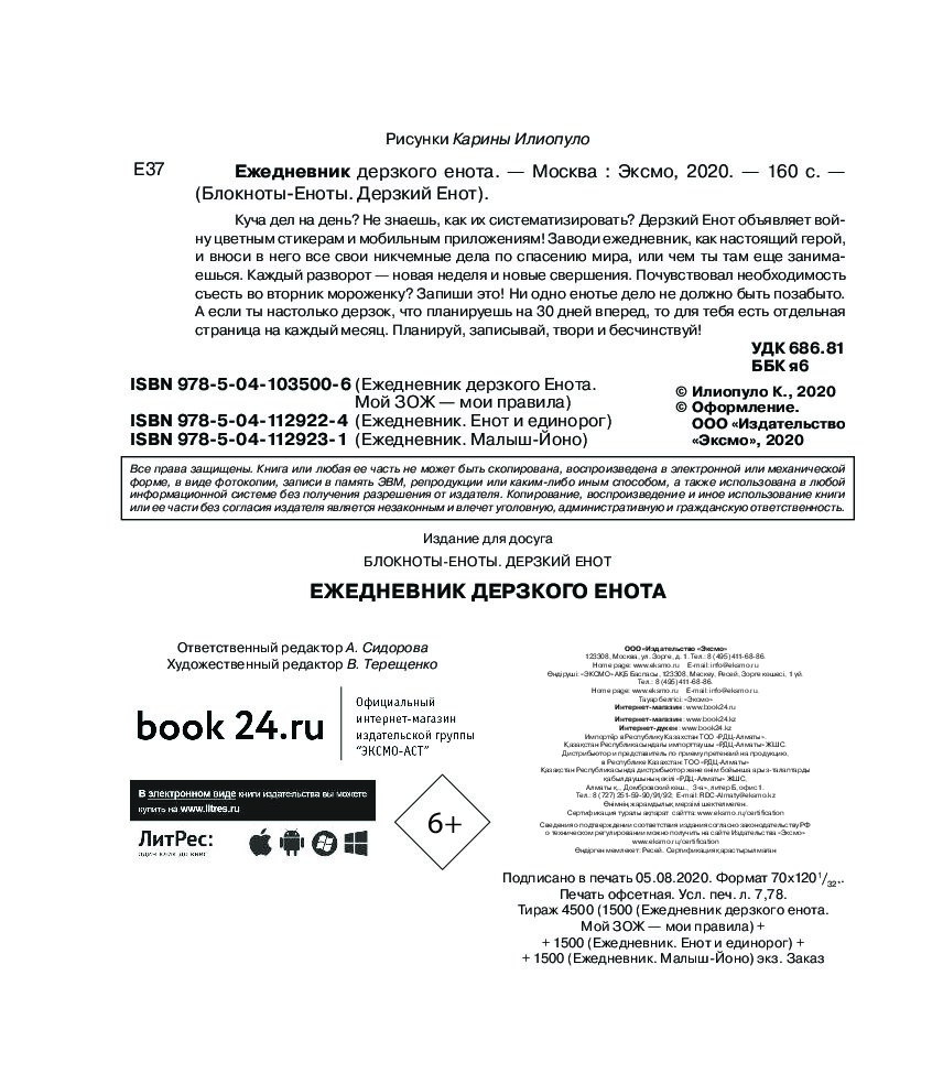 Смешные еноты помогут раскрасить твои будни в безумные краски! Из своих уютных домиков в мусорных баках они добрались до страниц ежедневников и забавляются как хотят: воруют еду и переодеваются в известных героев, танцуют с авокадо и спят без задних лап, скачут на строчках и злят домашних котиков.