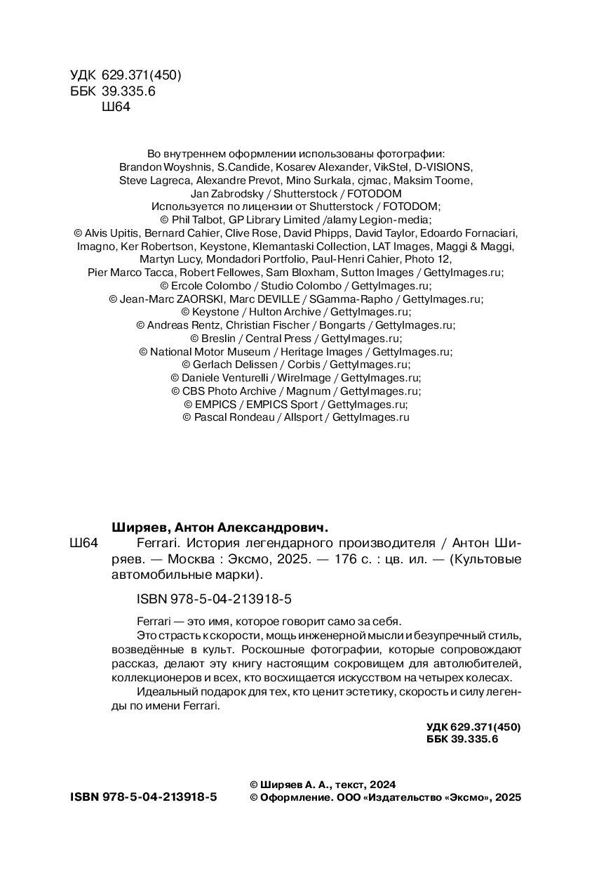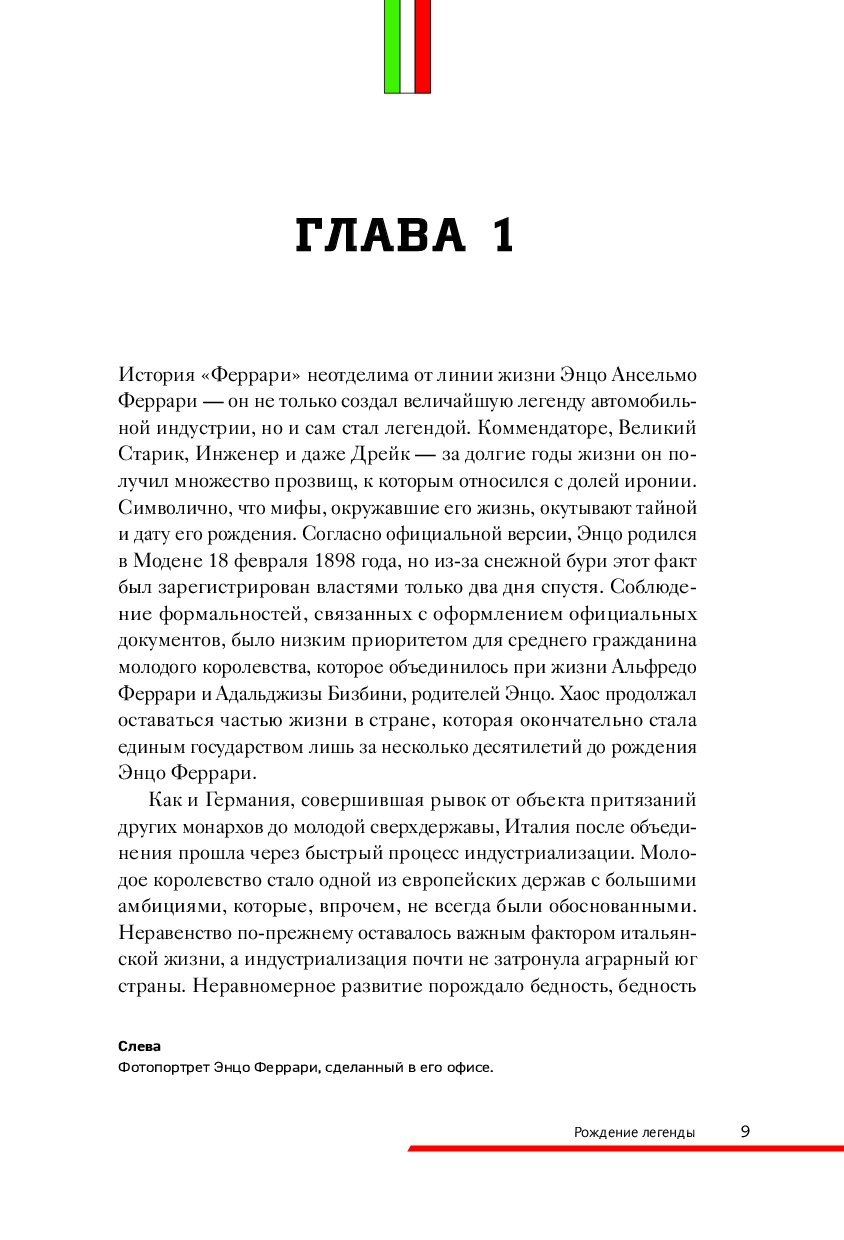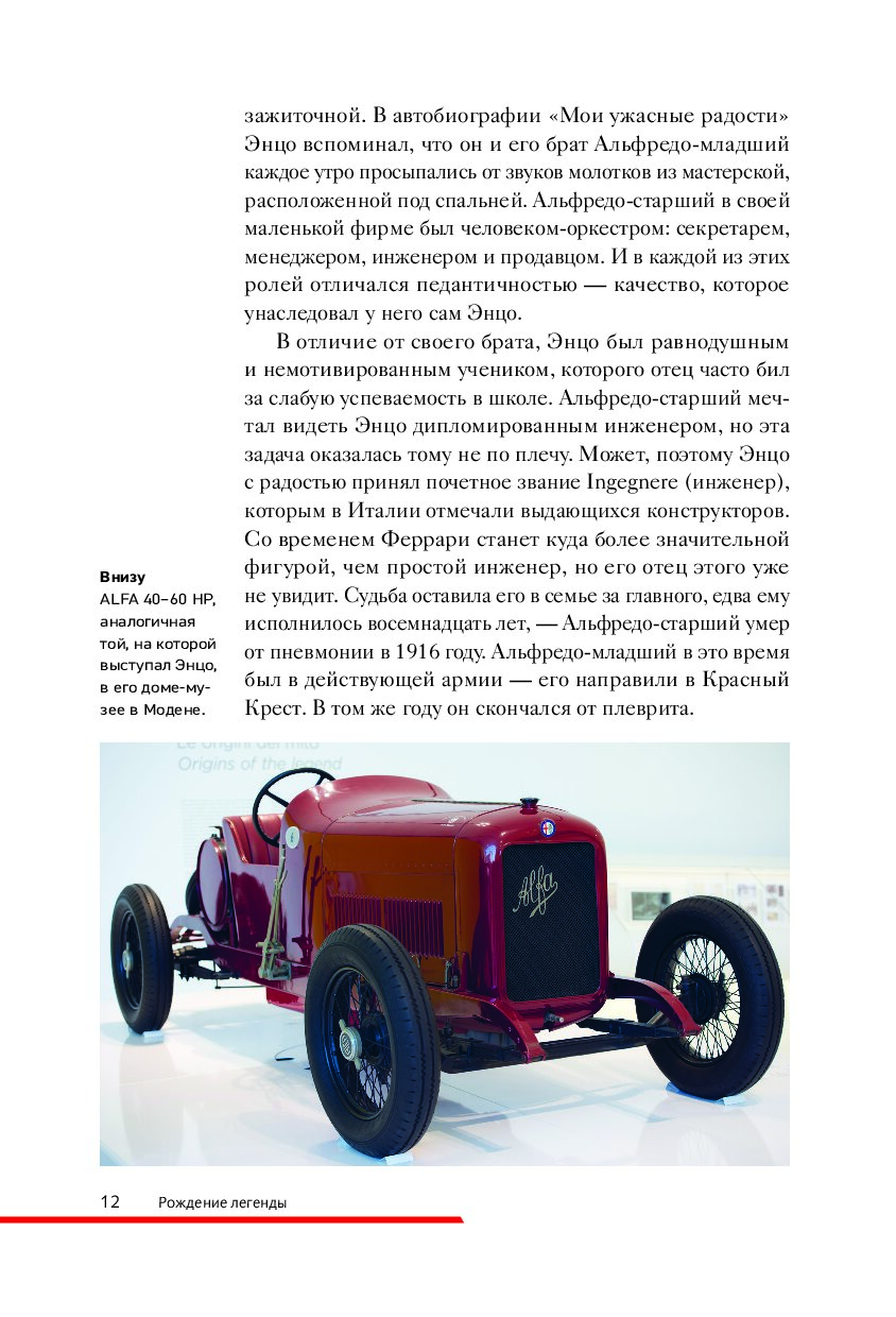 Книга, которую вы держите в руках, — это ода страсти, скорости, дизайну и безупречному мастерству, которые сделали Ferrari синонимом совершенства. От первых дней в мастерской отца Энцо Феррари до триумфов на трассах «Формулы-1» и культовых моделей, которые стали символом инженерного гения их создателя — вас ждет вдохновляющее путешествие по легендарной истории одного из самых престижных автомобильных брендов в мире. Вы окунетесь в богатую и захватывающую хронику жизни человека, превратившего автомобиль в мечту миллионов. Роскошные фотографии, которые сопровождают рассказ, делают эту книгу настоящим сокровищем для автолюбителей, коллекционеров и всех, кто восхищается искусством на четырех колесах.