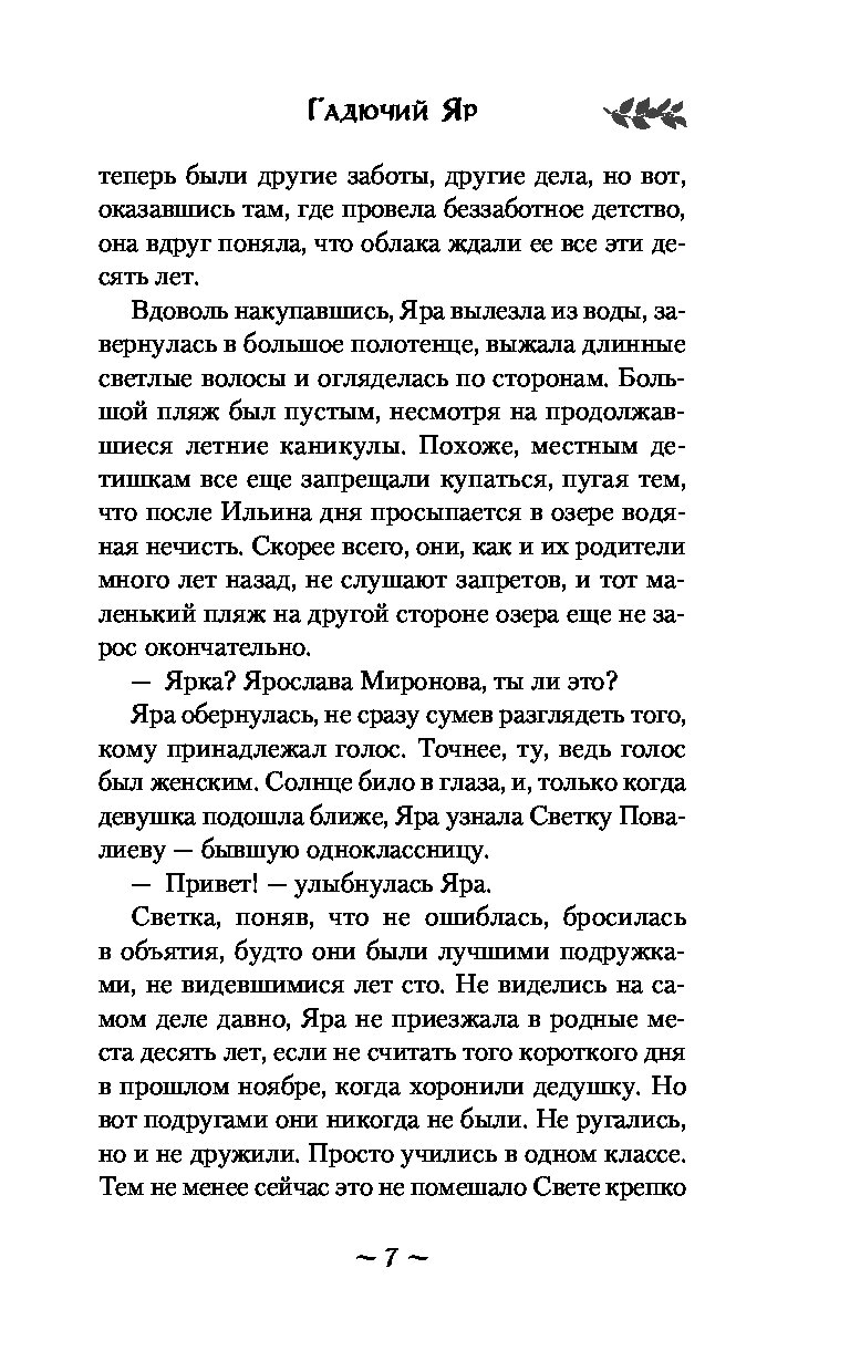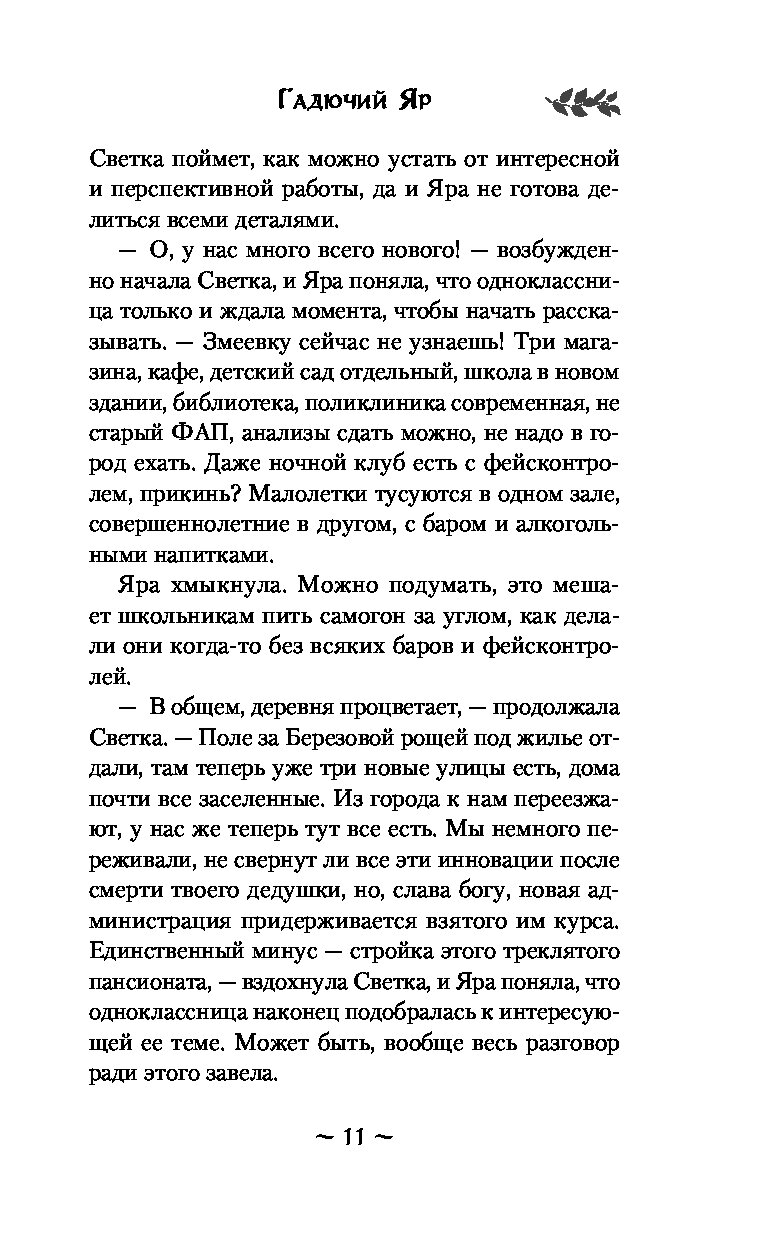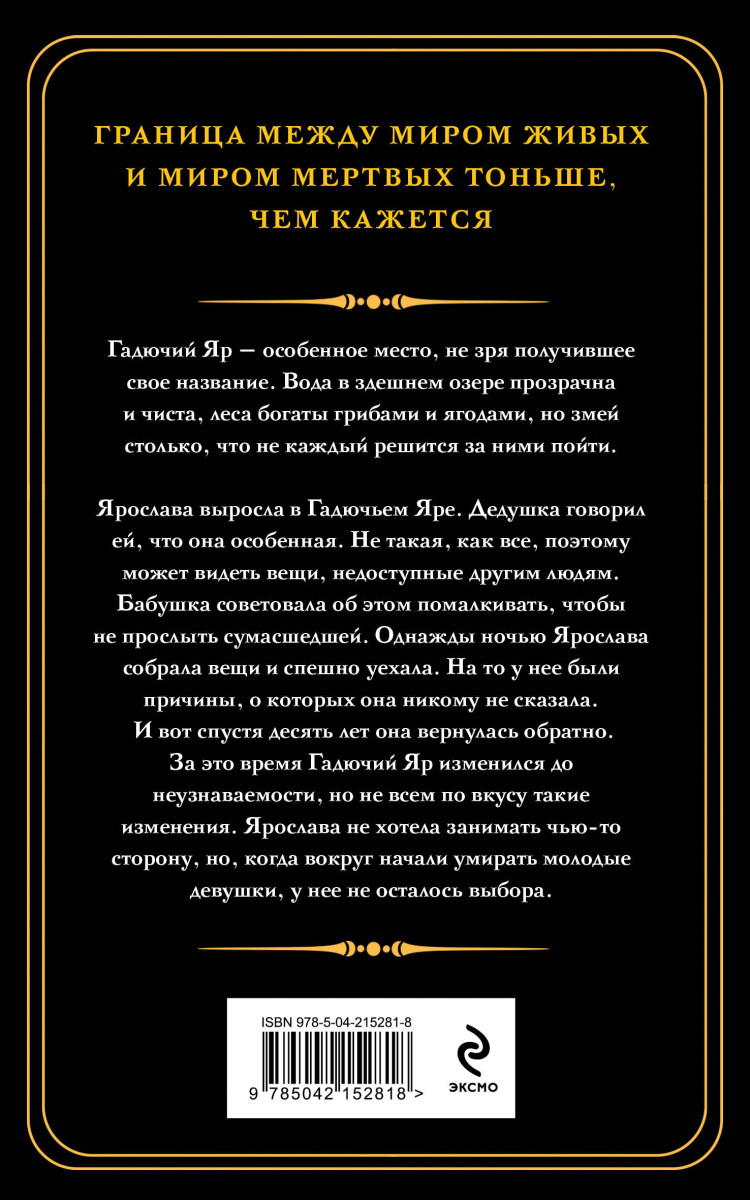 Ярослава выросла в Гадючьем Яре. Дедушка говорил ей, что она особенная. Не такая, как все, поэтому может видеть вещи, недоступные другим людям. Бабушка советовала об этом помалкивать, чтобы не прослыть сумасшедшей. Однажды ночью Ярослава собрала вещи и спешно уехала. На то у нее были причины, о которых она никому не сказала. И вот спустя десять лет она вернулась обратно. За это время Гадючий Яр изменился до неузнаваемости, но не всем по вкусу такие изменения. Ярослава не хотела занимать чью-то сторону, но когда вокруг начали умирать молодые девушки, у нее не осталось выбора.