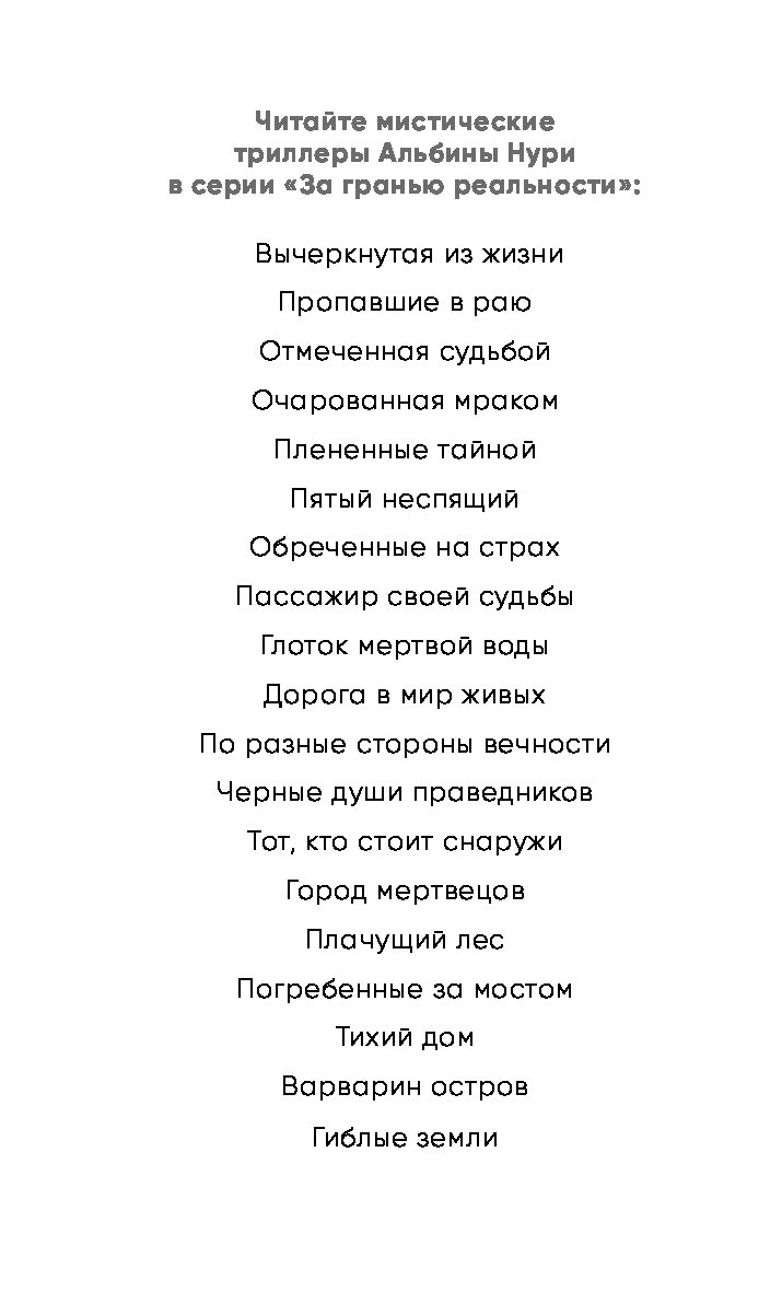 Альбина Нури не боится шагнуть за границы непознанного. В ее мистических триллерах из авторской серии «За гранью реальности» наш мир переплетается с зазеркальем, и только во власти героев сделать выбор, на какой стороне остаться.