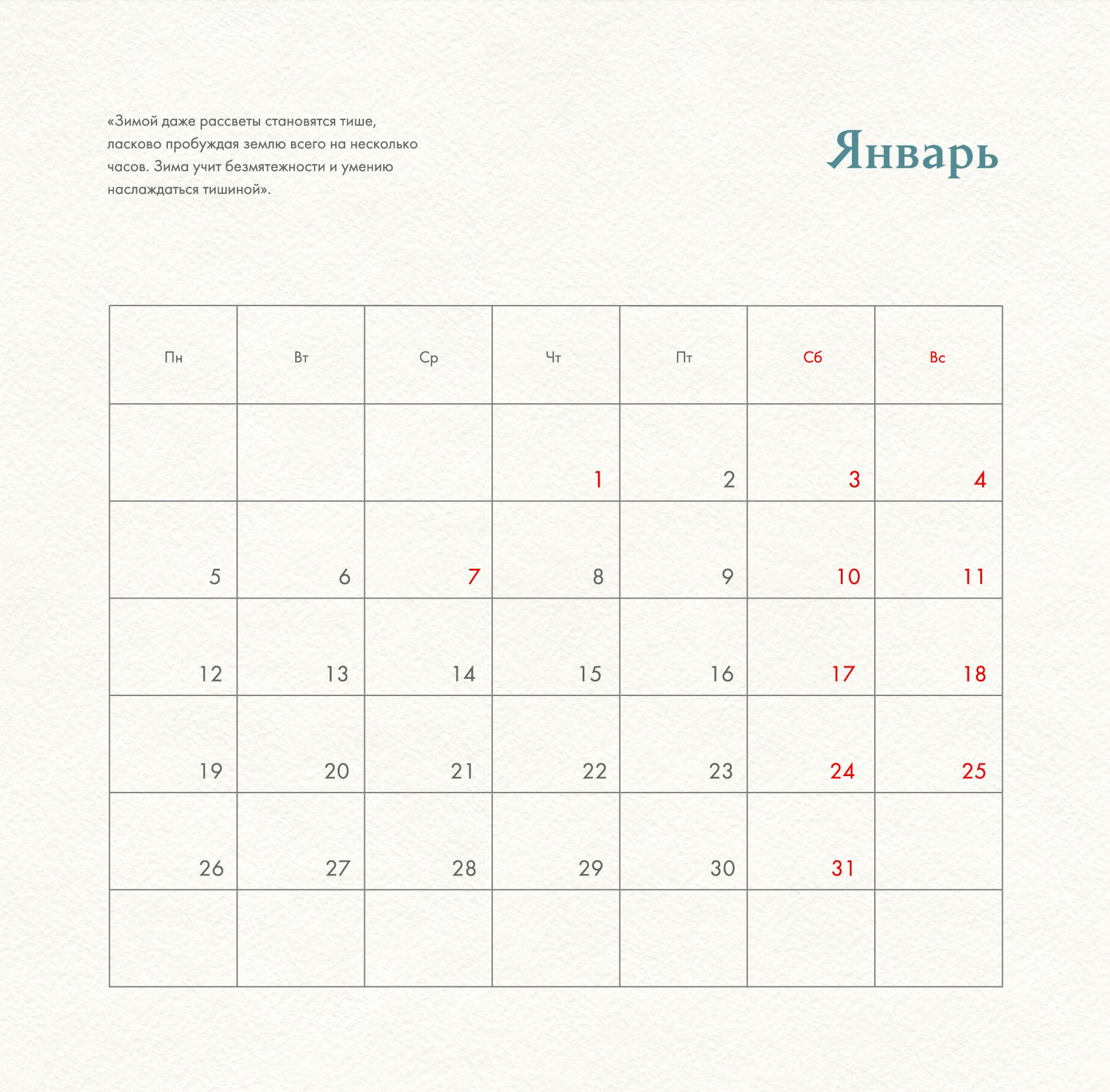 - Календарная сетка — с разбивкой по месяцам.