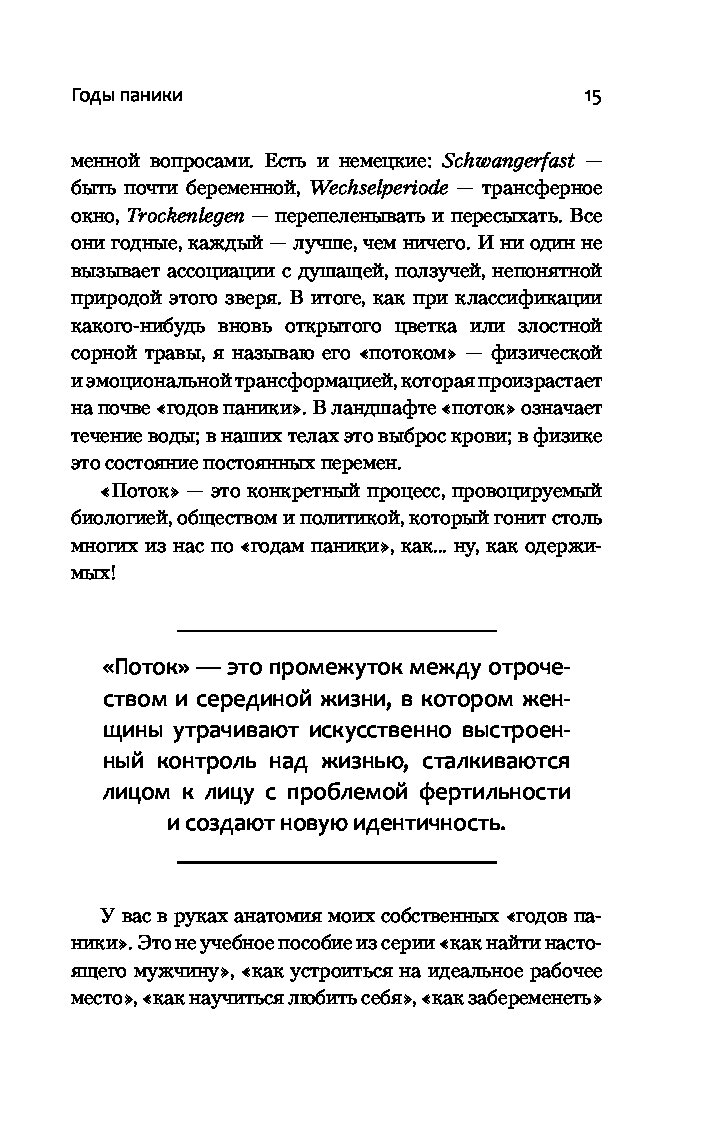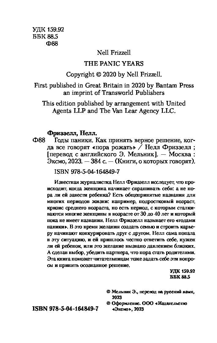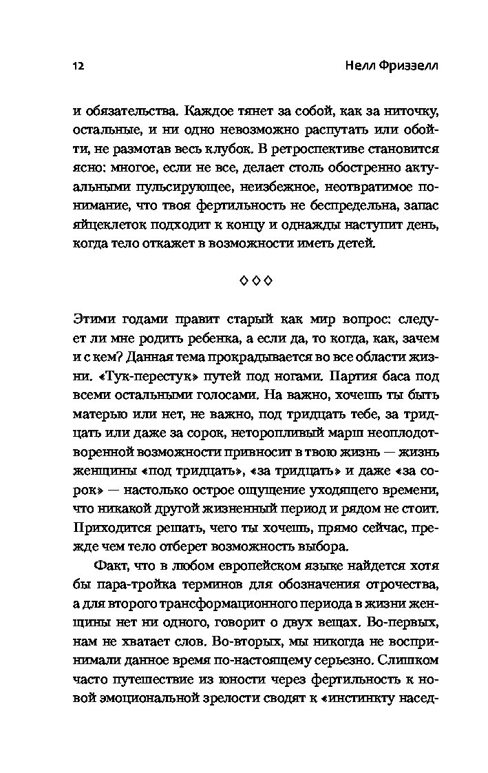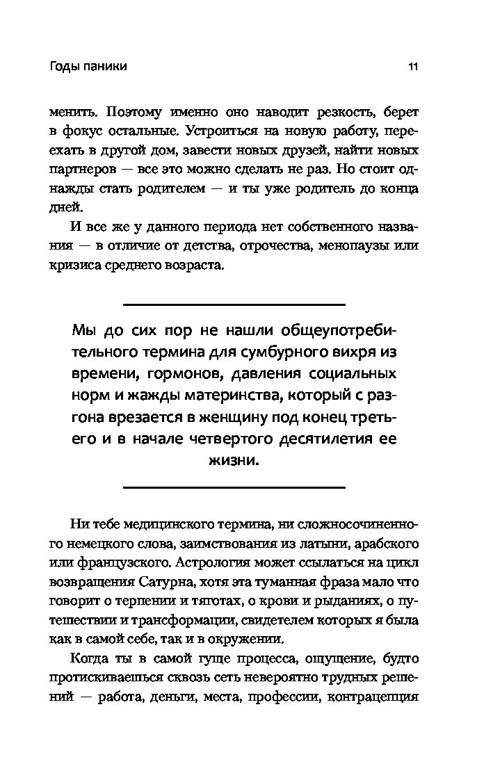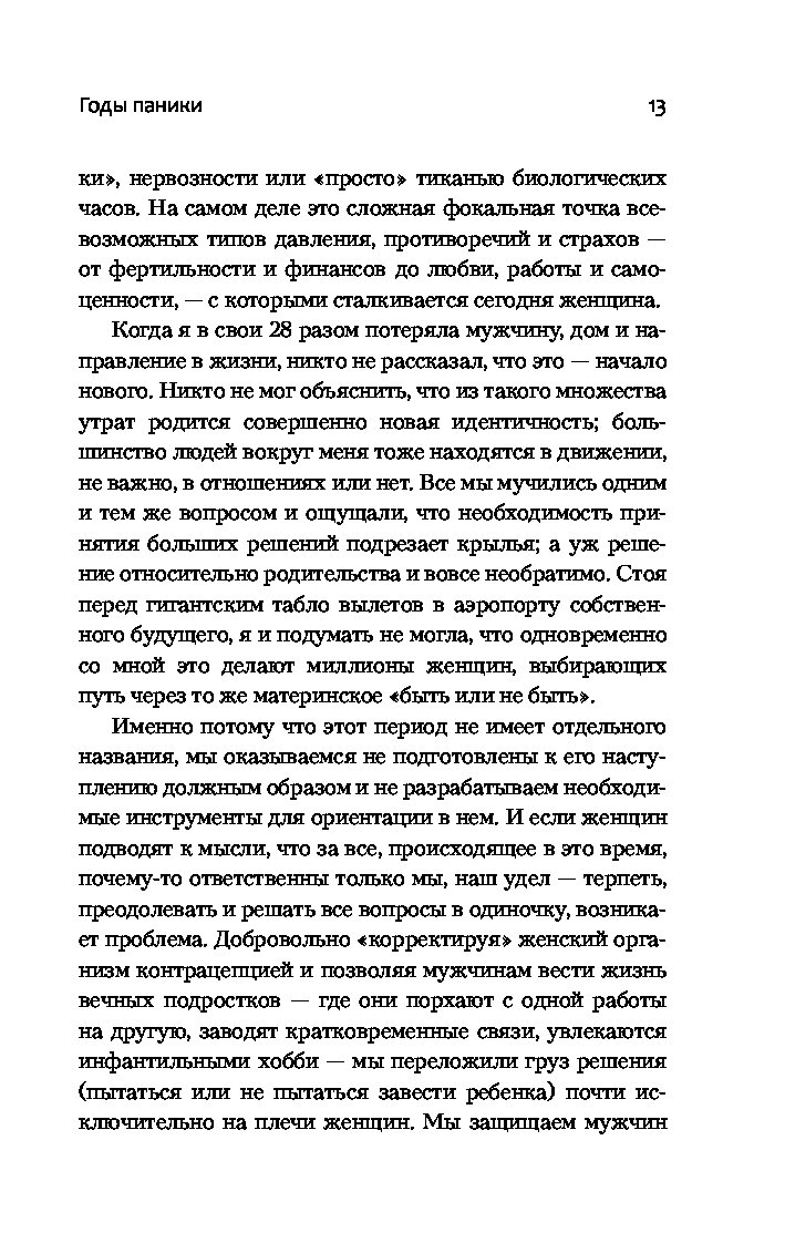 Известная журналистка Нелл Фриззелл исследует, что происходит, когда женщина начинает спрашивать себя: а не пора ли ей завести ребенка? Есть общепринятые названия для многих периодов жизни: например, подростковый возраст, кризис среднего возраста, но есть период, с которым сталкиваются многие женщины в возрасте от 30 до 40 лет и который пока не имеет названия. Нелл Фриззелл называет его «годами паники». В это время желания создать семью и строить карьеру начинают конкурировать друг с другом. Нелл сама попала в эту ситуацию, и ей пришлось честно ответить себе, нужен ли ей ребенок или это желание вызвано давлением близких. А сделав выбор, убедить партнера, что пора стать родителями. Эта книга поможет читательницам тоже задать себе эти вопросы и принять осознанное решение.