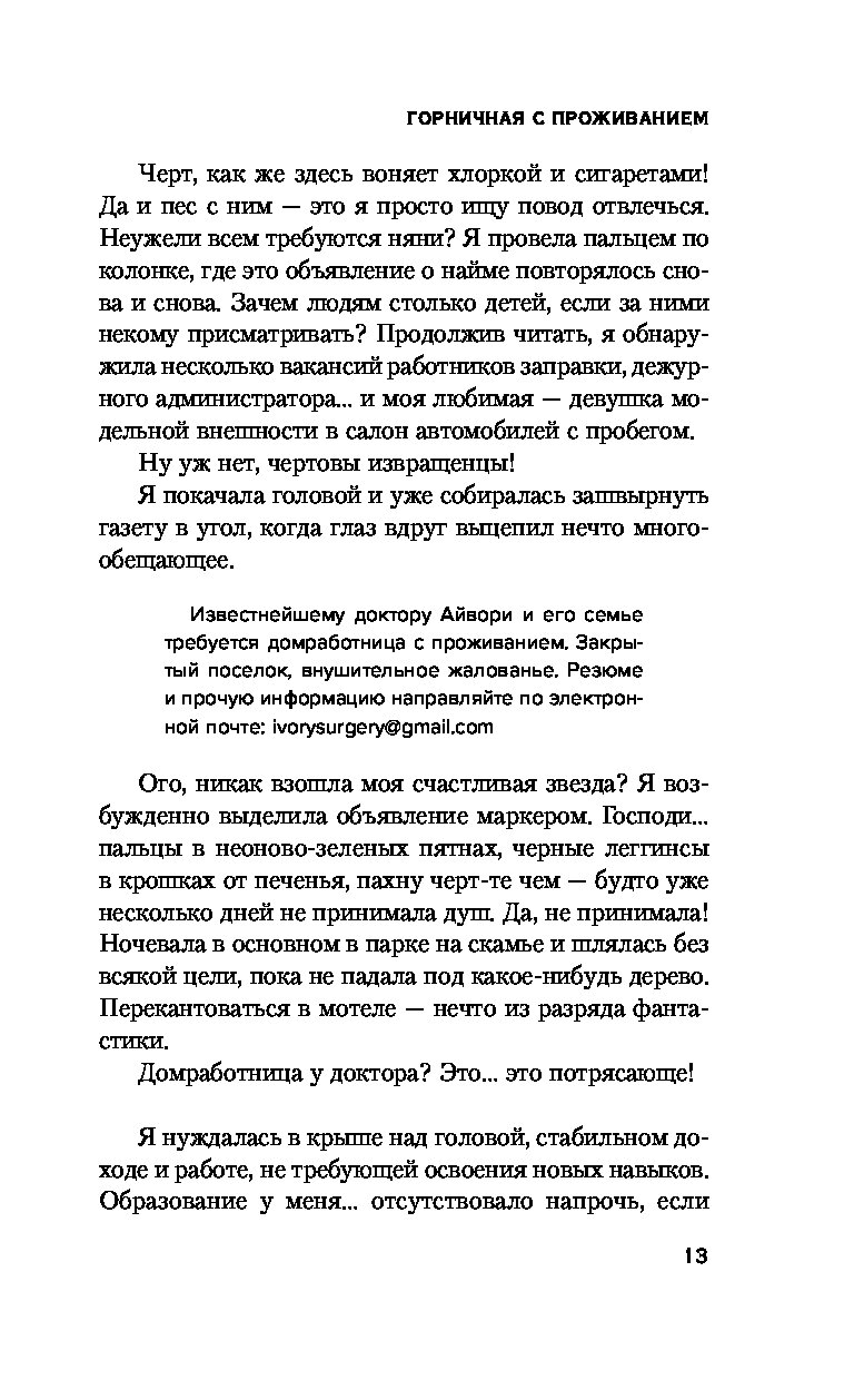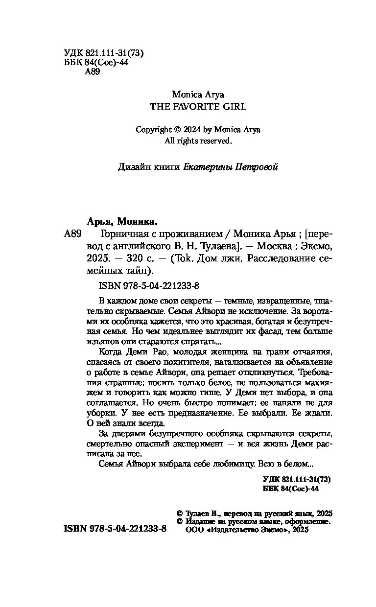 Когда Деми Рао, молодая женщина на грани отчаяния, спасаясь от своего похитителя, наталкивается на объявление о работе в семье Айвори, она решает откликнуться. Требования странные: носить только белое, не пользоваться макияжем и говорить как можно тише. У Деми нет выбора, и она соглашается. Но очень быстро понимает: ее наняли не для уборки. У нее есть предназначение. Ее выбрали. Ее ждали. О ней знали всегда.