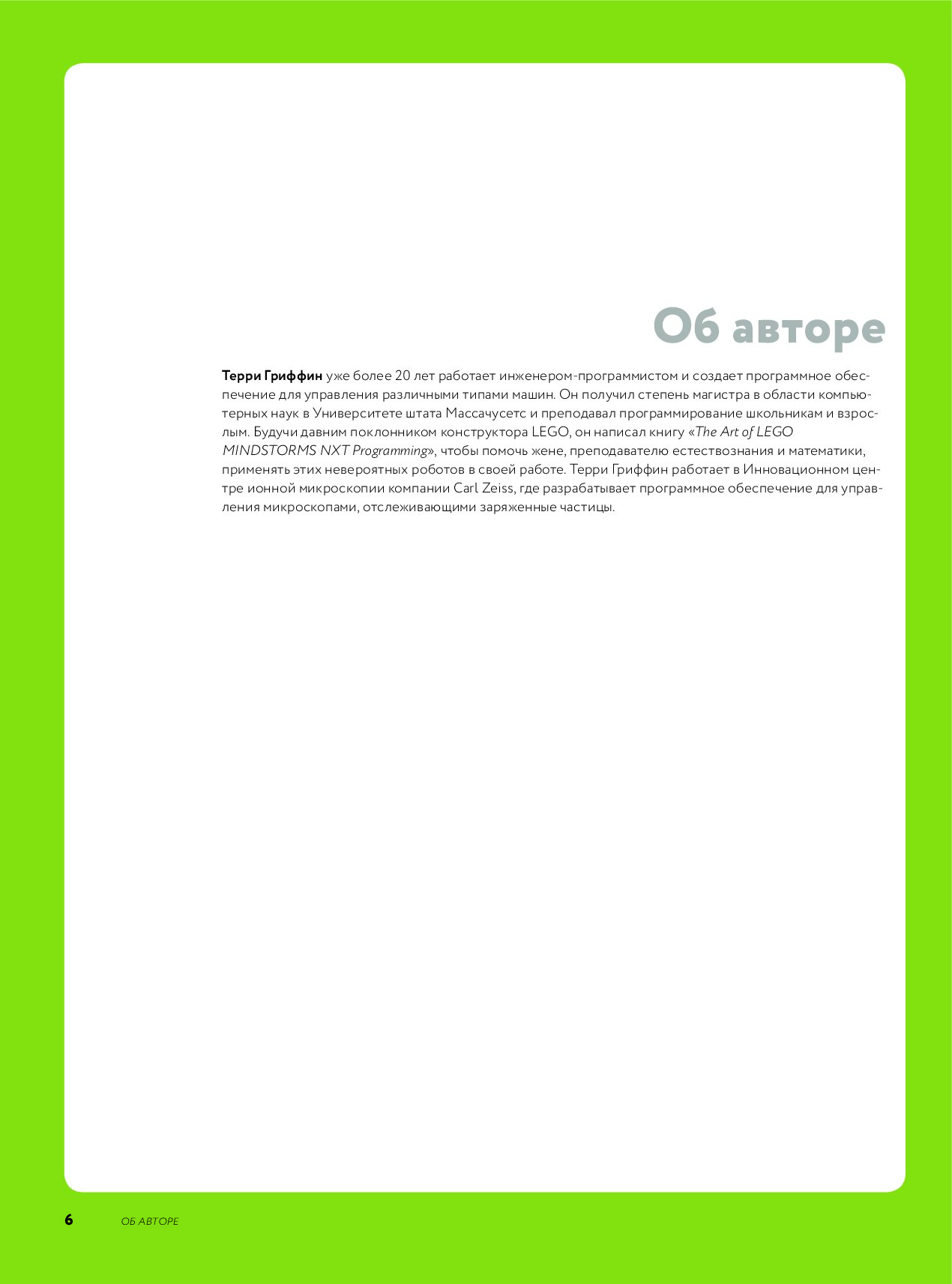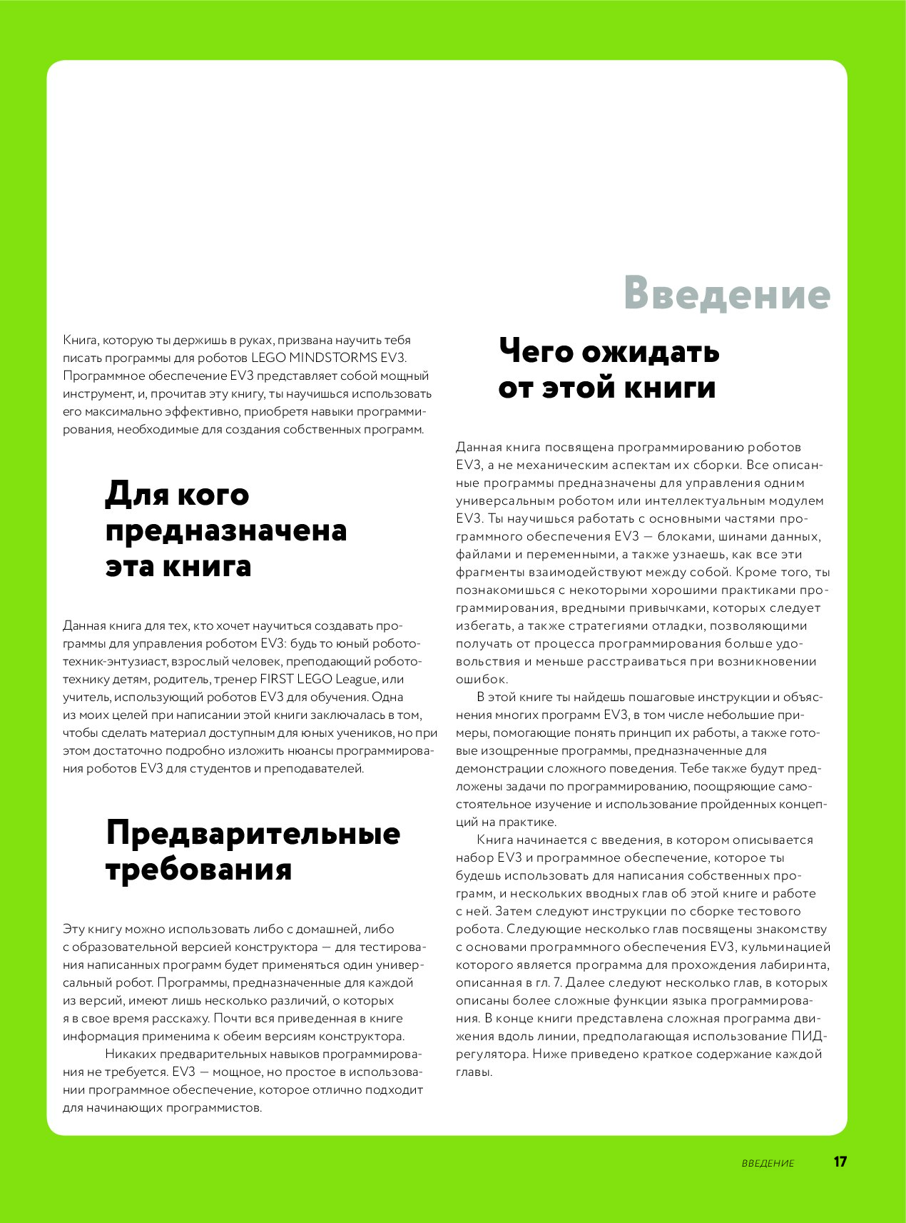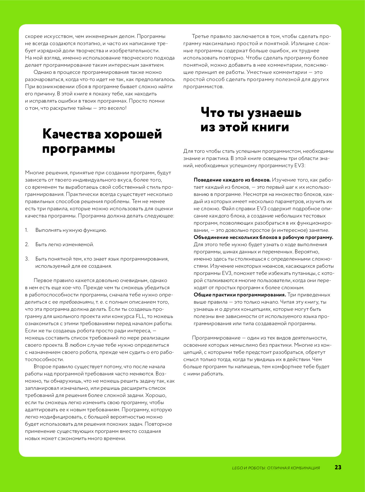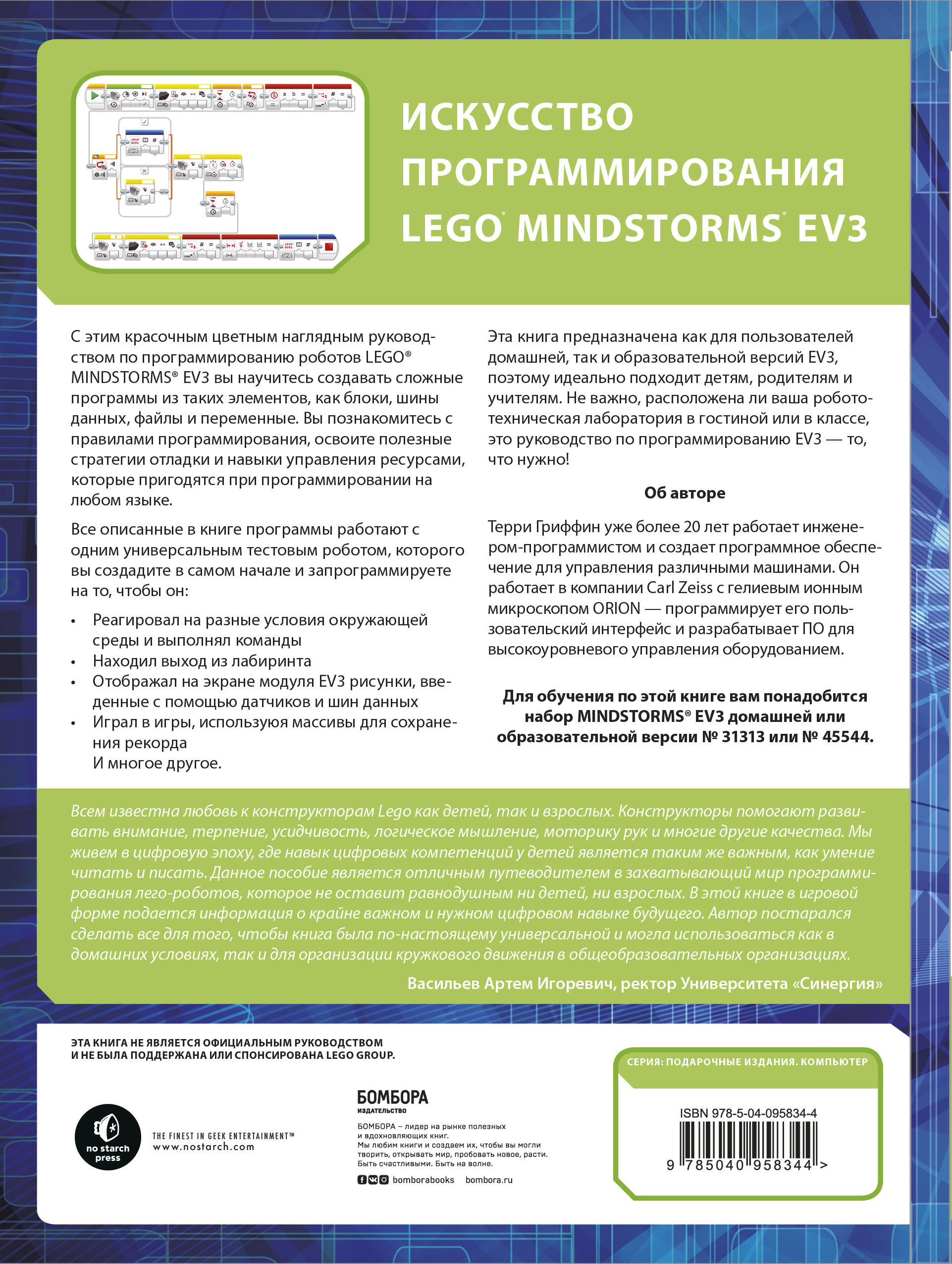 Станьте суперпрограммистом, собирайте роботов из конструктора LEGO MINDSTORMS EV3 и управляйте ими! С этой цветной книгой, снабженной множеством понятных иллюстраций, вы без труда освоите язык программирования для управления вашим роботом LEGO, напишете свои первые программы, узнаете такие важные понятия, как блоки, шины данных, файлы и переменные. Занимайтесь по ней дома или в школе робототехники, выполняйте интересные задания и наблюдайте, как робот, которого вы собрали собственными руками, учится выбираться из лабиринтов, выполняет команды, показывает на дисплее картинки и делает множество других крутых штук! Подходит как для самостоятельного изучения, так и для занятий с ребенком или учениками.