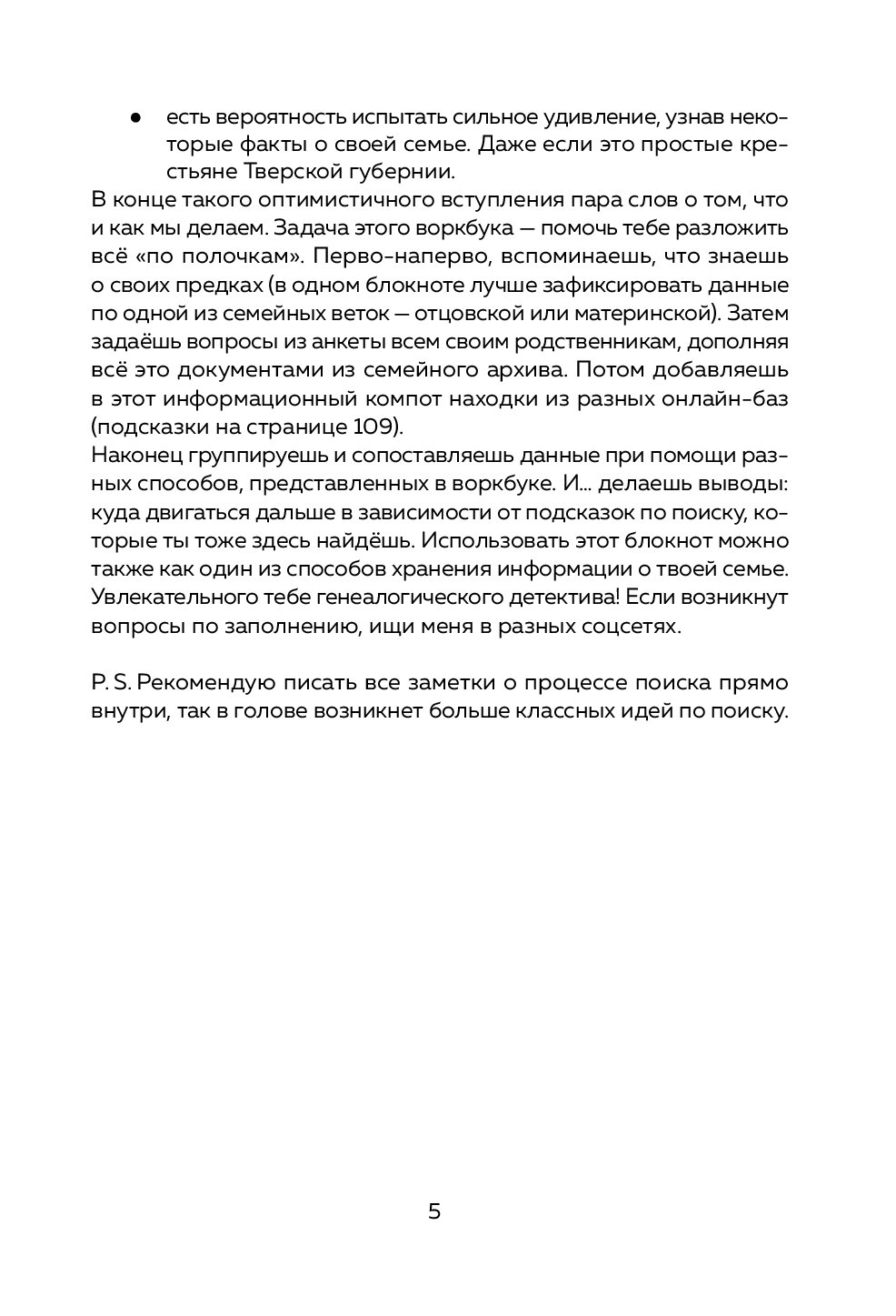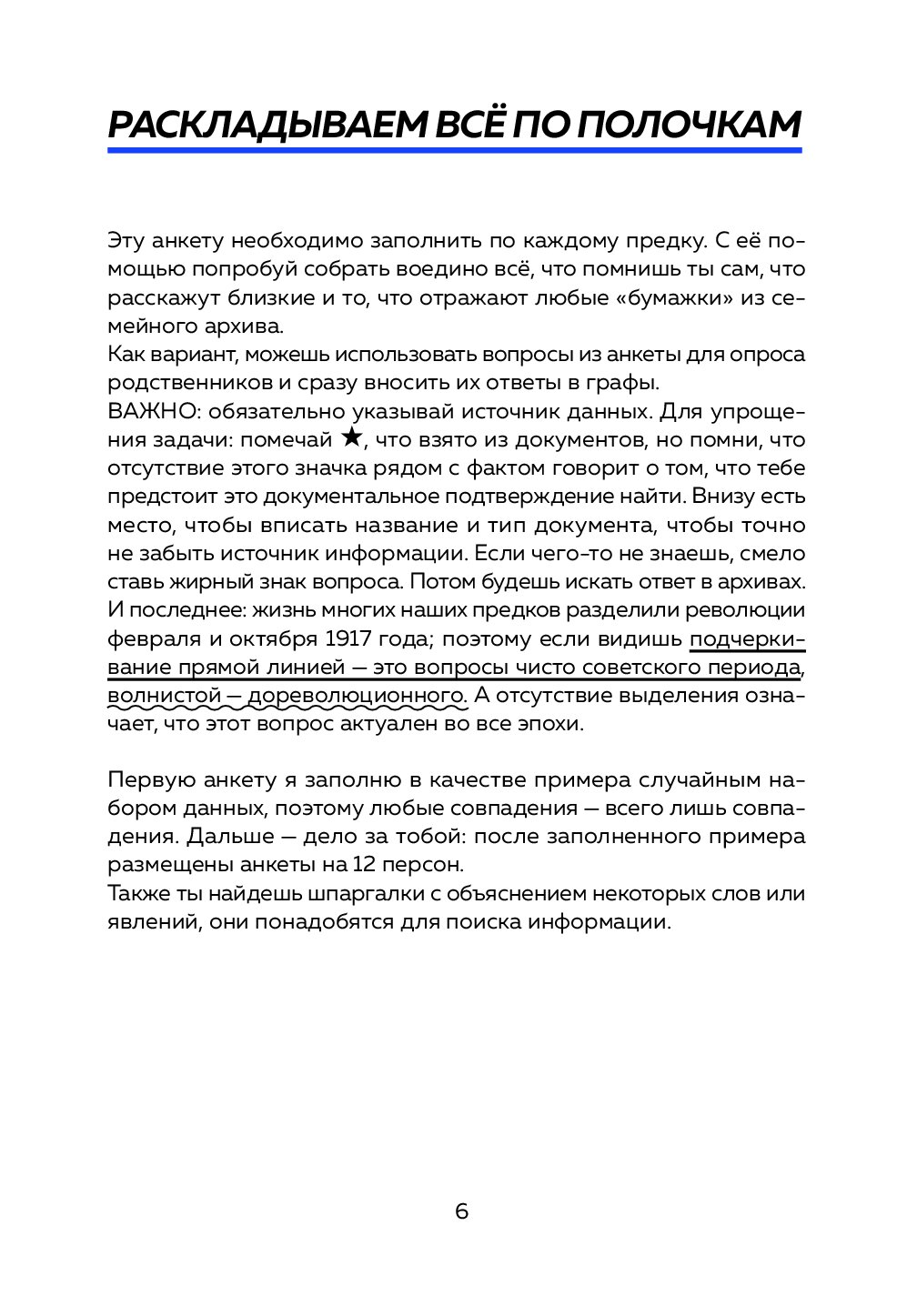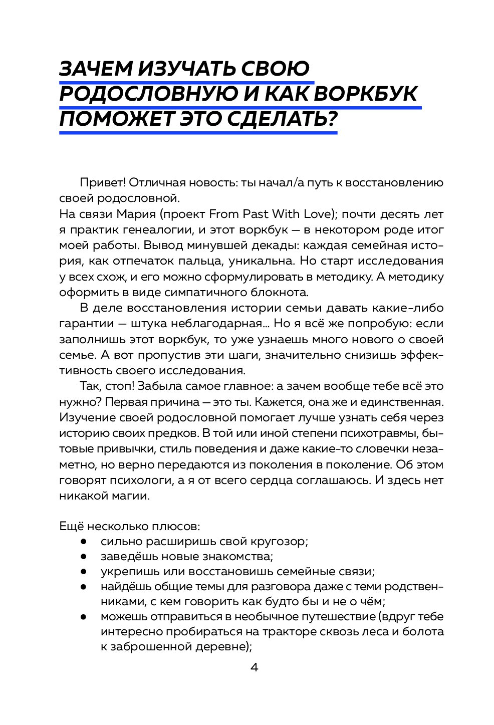 Мария Тычинина, генеалог с 10-летним опытом и автор проекта From Past With Love, создала этот пошаговый гид для всех, кто хочет сохранить связь с родом и гордо нести ее в будущее. С ним ты разгадаешь увлекательный детектив в виде прошлого своей семьи, сохранишь ценные данные и откроешь удивительные факты о своих предках. В процессе ты узнаешь, откуда в тебе эта стойкость — возможно, от прабабушки, пережившей войну, или почему в семье так ценят образование — а вдруг твой прадед был первым грамотным в деревне?