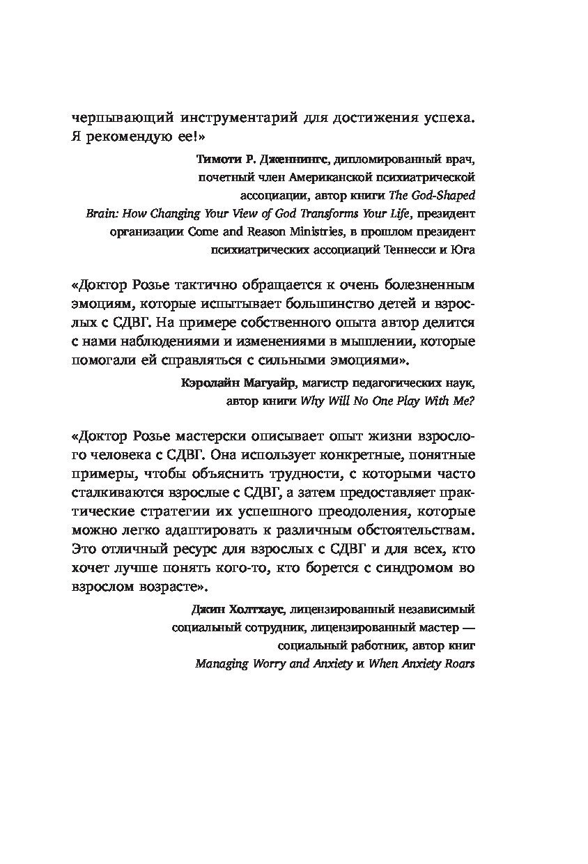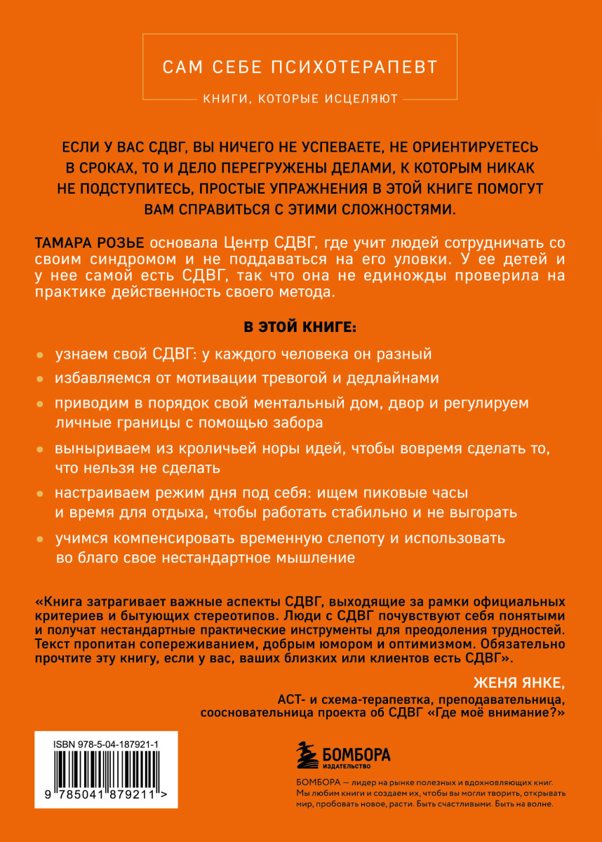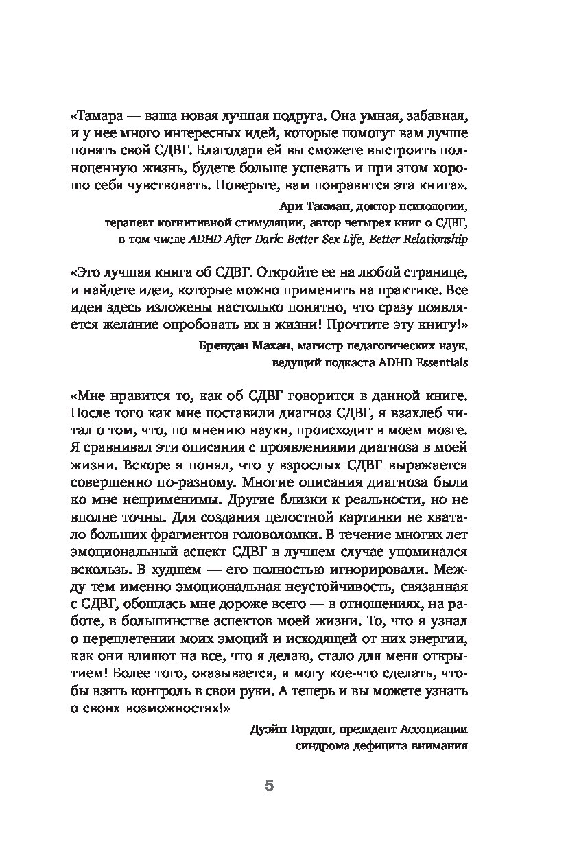 "Книга затрагивает важные аспекты СДВГ, выходящие за рамки официальных критериев и бытующих стереотипов. Люди с СДВГ почувствуют валидацию и получат нестандартные практические инструменты для преодоления трудностей. Текст пропитан сопереживанием, добрым юмором и оптимизмом. Обязательно прочтите эту книгу, если у вас, ваших близких или клиентов есть СДВГ".