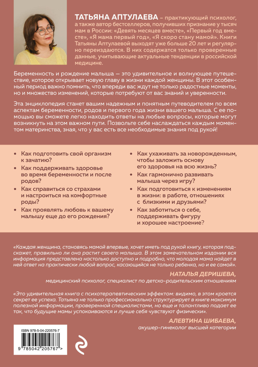 «Это удивительная книга с психотерапевтическим эффектом: видимо, в этом кроется секрет ее успеха. Татьяна не только профессионально структурирует в книге максимум полезной информации, проверенной специалистам, но еще и талантливо подает ее так, что будущие мамы успокаиваются и лучше себя чувствуют физически». — АЛЕВТИНА ШИБАЕВА, акушер-гинеколог высшей категории