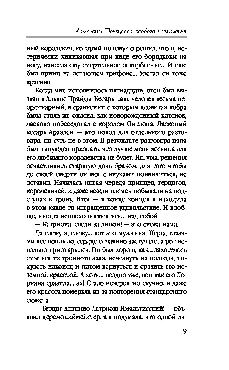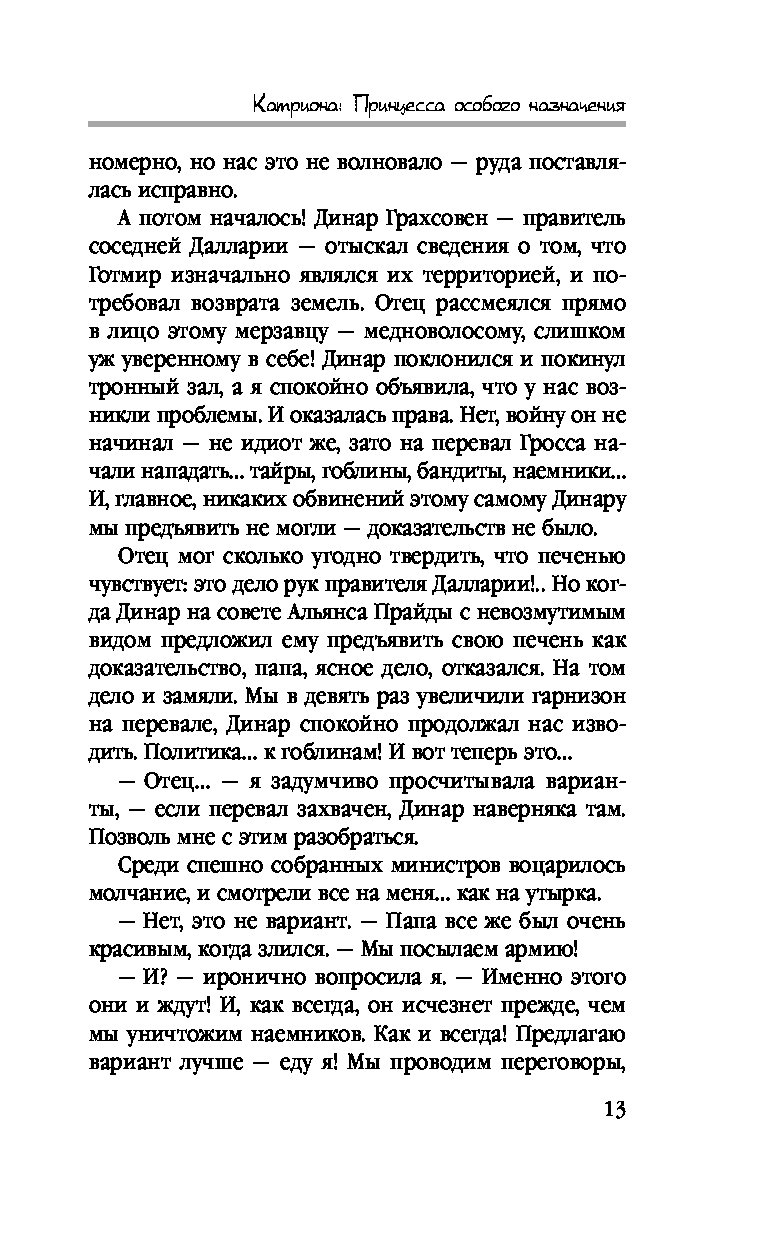 Она — не та, с чьим именем на устах рыцари совершают подвиги и чью красоту воспевают менестрели. Зато она умна, энергична, властолюбива... Знакомьтесь — Катриона Ринавиэль Уитримана, принцесса Оитлона. В простонародье — утырка. И пусть от наследницы Оитлона сбегают все женихи — ее враги их обгоняют. И пусть никто, даже собственные родители, не любят — зато все боятся. Но все это не может сделать Катриону счастливой... пока в один далеко не прекрасный день ее не похищает Динар Грахсовен, правитель Даларии. Жизнь Кат круто меняется — она обретает любящего отца, друзей и массу неприятностей, главная из которых - любовь. Но Катриона разберется! На то она и принцесса особого назначения...