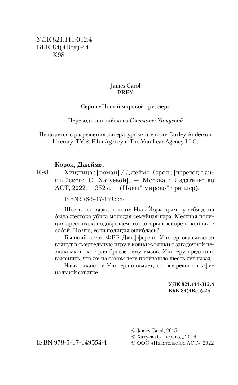 Купить книгу Хищница в интернет-магазине Book24.kz можно по лучшей цене. Напрямую сотрудничая с издательствами, мы сохраняем доступную стоимость всех книг и предлагаем покупателям выгодные условия продажи. Гарантируем адресную доставку заказов по Казахстану в течение 1-9 дней, отправляем книги Казпочтой и EMC Актау, Актобе, Атырау, Караганду, Кокшетау, Костанай, Кызылорду, Павлодар, Петропавловск, Талдыкорган, Тараз, Уральск, Усть-Каменогорск, Шымкент, Алматы, Астану и другие города. Заказать книгу у нас не составит труда, стоит только выбрать из каталога интересующее издание с фото и кратким описанием и сделать оформление заказа по телефону или онлайн. Мы позаботимся, чтобы вы получили книгу как можно скорее.
