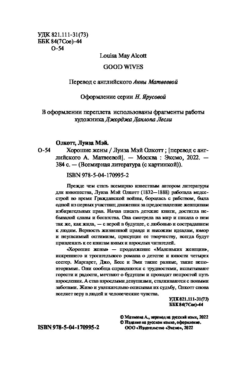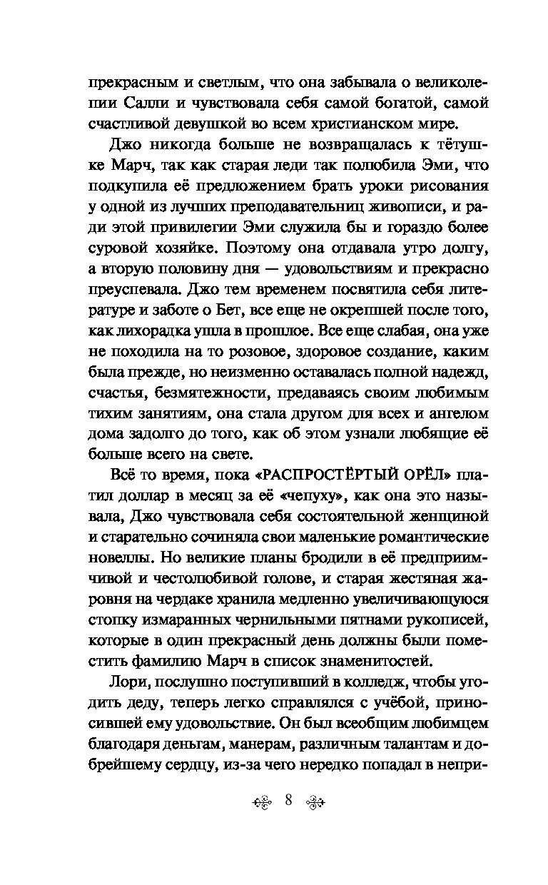 Эта светлая книга вызывает улыбку, отвлекает от бед и погружает в атмосферу уюта и тепла. Роман способен поднять настроение читателям любого возраста. История семейства Марч была неоднократно перенесена на широкие экраны. Последняя экранизация 2019 года со звездами мирового масштаба в главных ролях покорила сердца зрителей и кинокритиков, а также была номинирована на «Оскар» в шести категориях и получила награду за «Лучший дизайн костюмов».