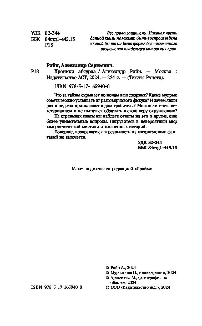 Хотите купить книгу Хроники абсурда? В каталоге нашего книжного интернет-магазина вы найдете лучшие образцы художественной литературы, классические произведения, жемчужины отечественной и мировой поэзии. Все книги предлагаем недорого. В интернет-магазине Book24.kz можно не только заказать книгу по доступной цене, но и воспользоваться сервисом курьерской доставки. Отправляем заказы во все города РК: Алматы, Астана, Актау, Актобе, Атырау, Караганда, Кокшетау, Костанай, Кызылорда, Павлодар, Петропавловск, Талдыкорган, Тараз, Уральск, Усть-Каменогорск, Шымкент, и другие. Доставка занимает 1-9 дней.