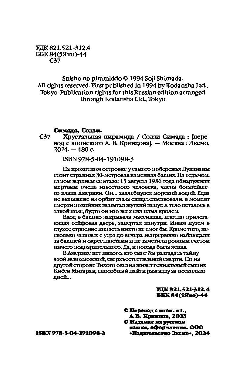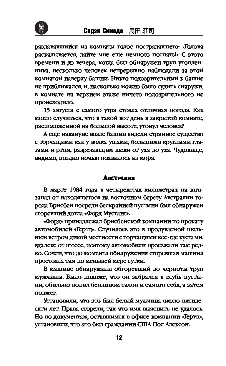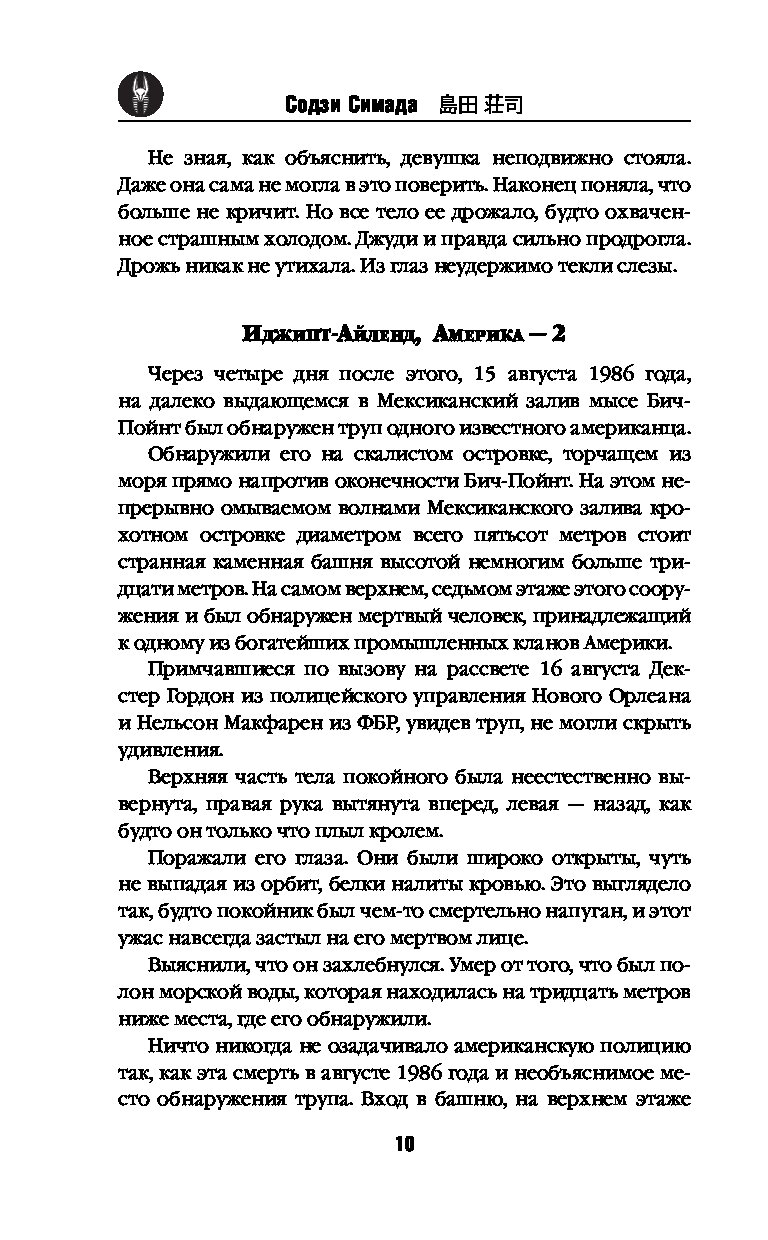В Америке нет никого, кто смог бы разгадать тайну этой невозможной, сверхъестественной смерти. Но на другой стороне Тихого океана живет гениальный сыщик Киёси Митараи, способный найти разгадку за несколько дней…