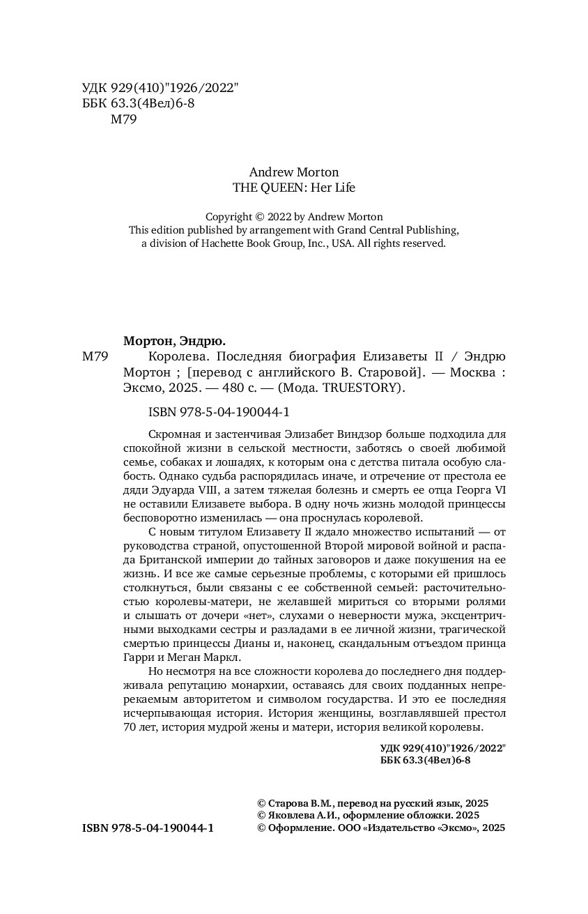 «Королева» — последняя биография Елизаветы II, изданная за несколько месяцев до ее кончины. В ней известный королевский биограф Эндрю Мортон рассказывает исчерпывающую историю Елизаветы II со дня ее рождения до последних дней жизни, исследует ее влияние как на Объединенное королевство, так и на остальной мир на протяжении большей части прошлого столетия. Раскрывает настоящую историю женщины, которую будут помнить как мать и бабушку Великобритании и как одну из величайших суверенных правительниц современной эпохи.