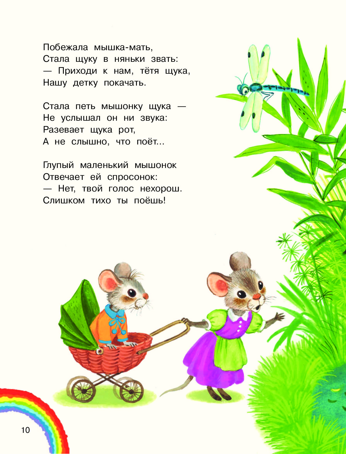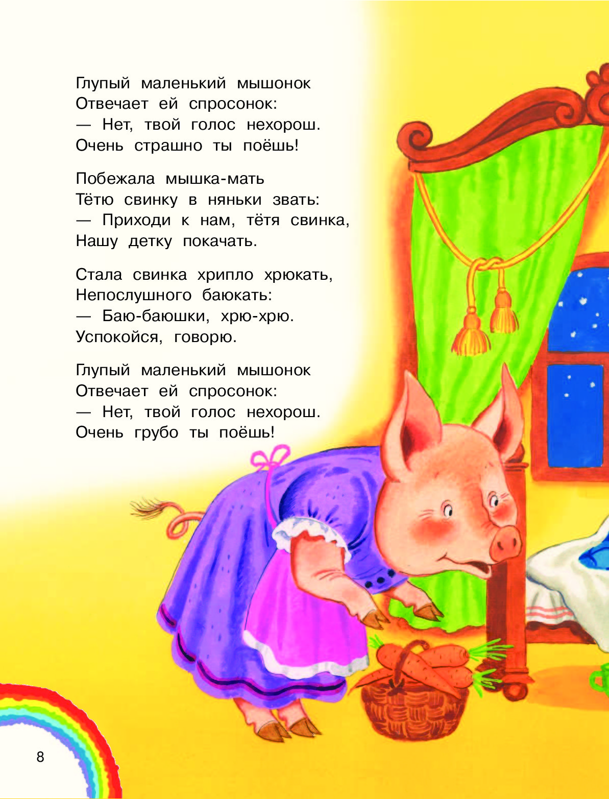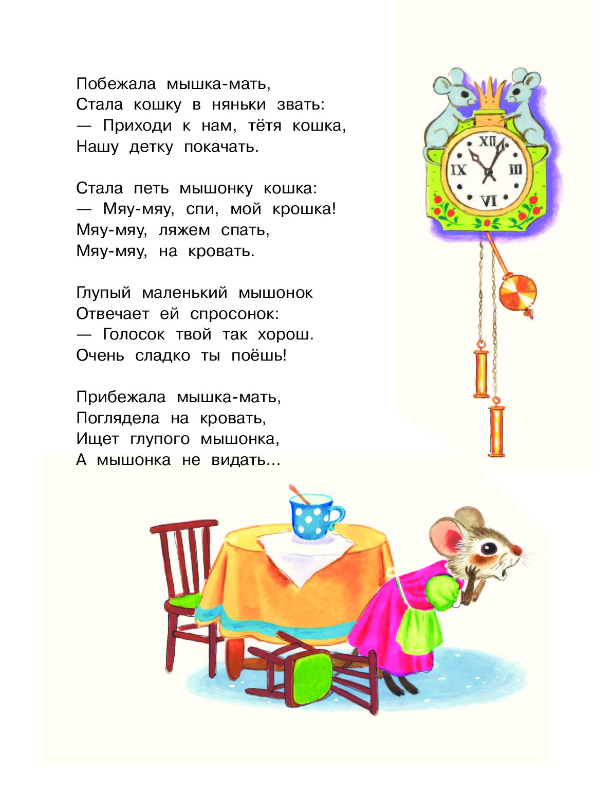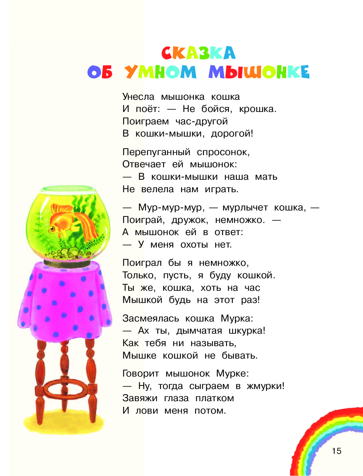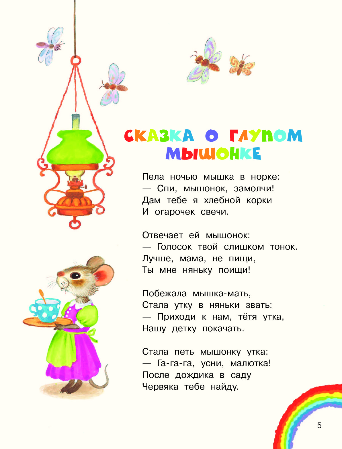 В нашей красивой большой книге любимые сказки малышей «Сказка о глупом мышонке», «Сказка об умном мышонке», «Курочка ряба и десять утят», «Тихая сказка» и две сказки для чтения и представления «Теремок» и «Кошкин дом».  Сочинил эти сказки С. Маршак очень давно, но  до сих пор ребята с удовольствием их читают, а стихотворные сказки  многие знают наизусть.  И это неудивительно  - С. Маршак любил, понимал детскую душу и был очень талантливым поэтом и  писателем. Для дошкольного возраста.
