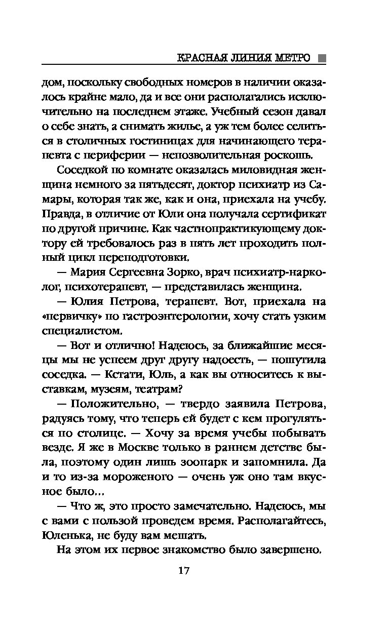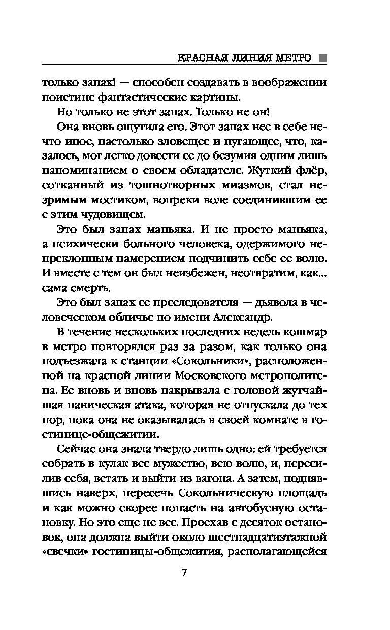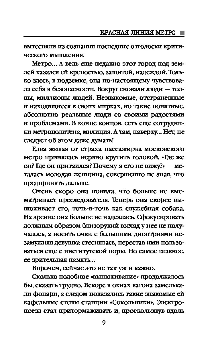 «Эта книга заставит вас погрузиться в самые темные глубины больной психики маньяка, узнать, как он мыслит и что чувствует. "Красная линия метро" — неожиданный по стилю психологический триллер, в котором читатель сможет и оказаться внутри убийцы, и увидеть его глазами жертвы». — Александра Маринина